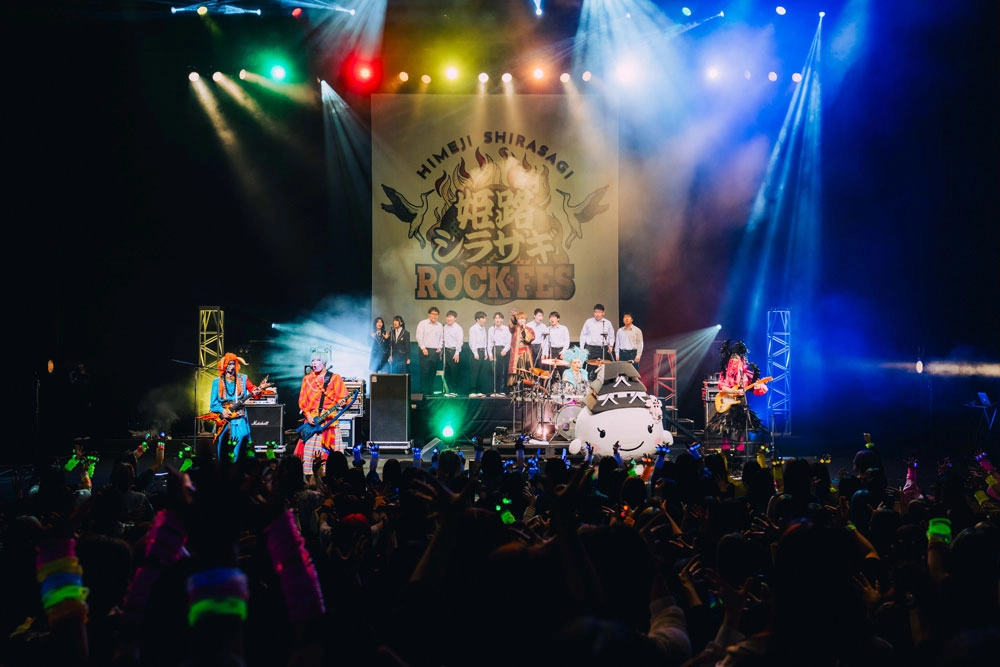 最後に届けられたのは、昨年『姫路シラサギROCK FES』を開催するにあたり、特別な思いを込めてつくり上げられた「シラサギ」。その曲が、昨年同様、seekの母校である姫路南・海稜高等学校のコーラス部のメンバーとともに丁寧に届けられた。さらに今年は、そのステージに姫路市のイメージキャラクターである「しろまるひめ」も登場。真っ白で真ん丸の可愛いルックス(頭上には姫路城も!)と動きでしっかり存在をアピールし、さらに最後には氣志團の綾小路翔の姿も。伸びやかなメロディがさわやかなコーラスとともに会場を満たし、心温まる感動的なフィナーレで、充実した一日目を締めくくった。