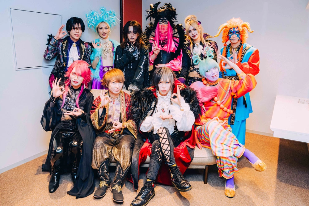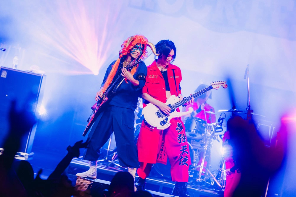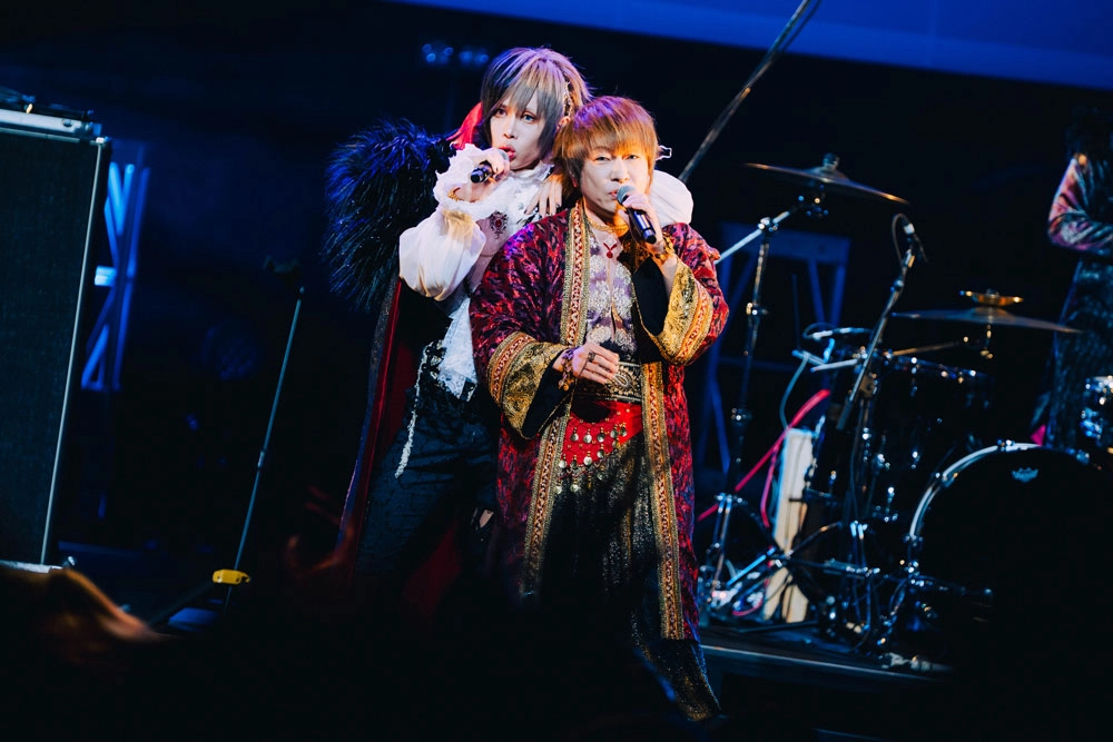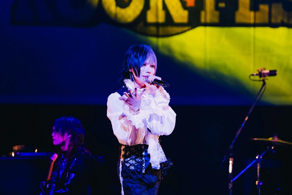 翌29日も、まずはPsycho le Cémuのお芝居から。続く「夢風車」では見様見真似でダンスを踊るPsycho le Cémuファン以外の観客も多く、出演者によって客席の雰囲気が変わるのを実感した。そこへトップバッターを務めたのは、0.1gの誤算。キャリア豊富なほかの出演バンドの中では、若手と言ってもいいだろう。そんな違いを味方につけた緑川裕宇のライヴ運びが見事で、DAISHI(Psycho le Cému)を迎えた「絶望メンブレガール」では先輩に容赦なく、「2ステップって知ってる?」「やってみろ、50歳!」と言い放ち、MCでNIGHTMAREのセットリストについて触れたかと思うと、バンギャの観客に、自分もヴィジュアル系を知っていると猛アピール。ハチャメチャな一方、きっちり準備してきたのだろうと真面目ささえうかがえるだけに、その人柄には好感しかない。