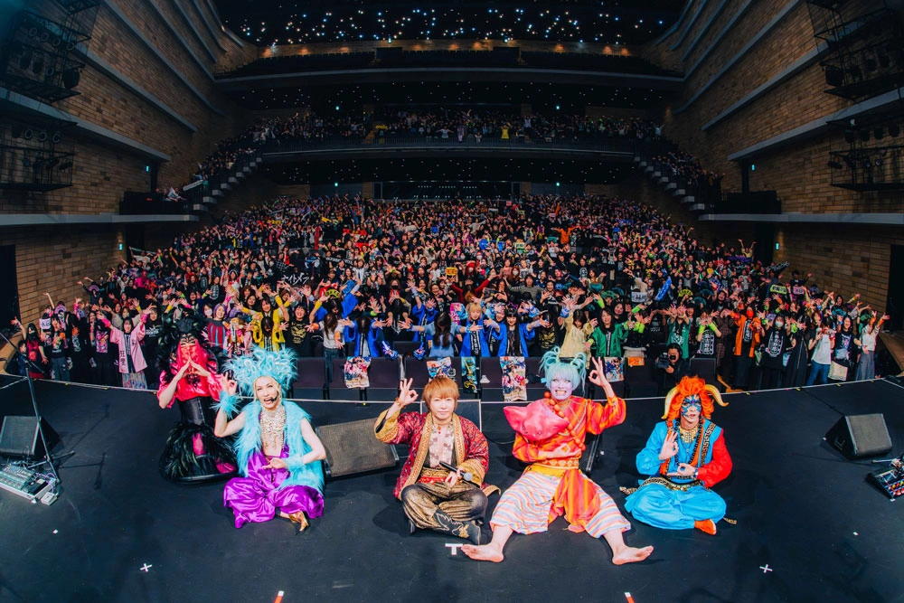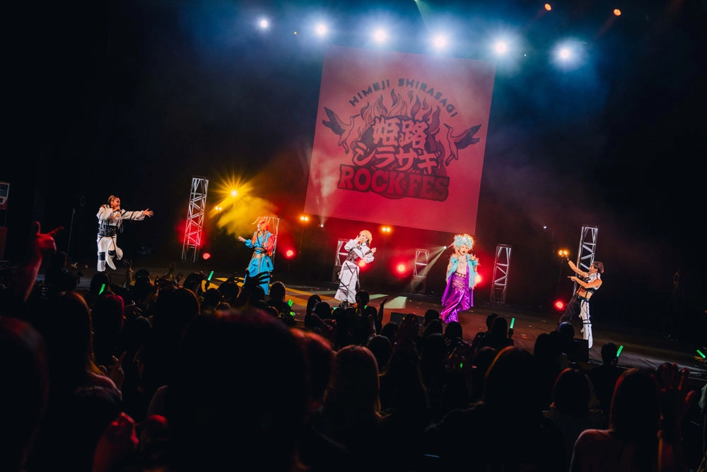 Psycho le Cémuと言えば、ロックバンドの枠にとどまることなくさまざまなパフォーマンスを見せることでも知られた存在だが、そんな彼らが主催するフェスのオープニングを飾るのは、彼らのお芝居。神の国、姫路に集った神々(Psycho le Cémuメンバー)が口にするのは、白鷺城の異名を持つ世界文化遺産の姫路城について。そう、このフェスのネーミングはもちろん姫路城にちなんでいるのだ。