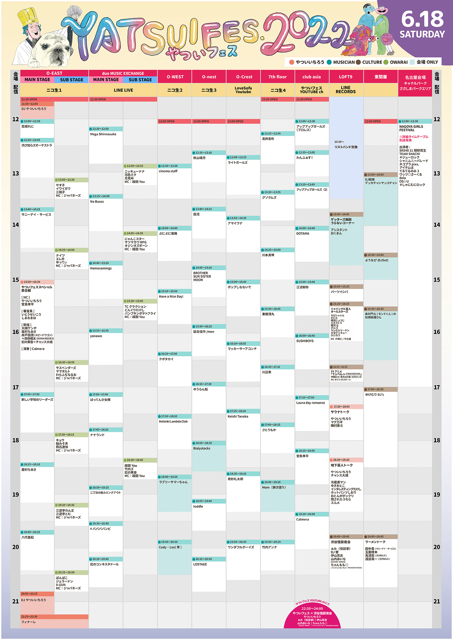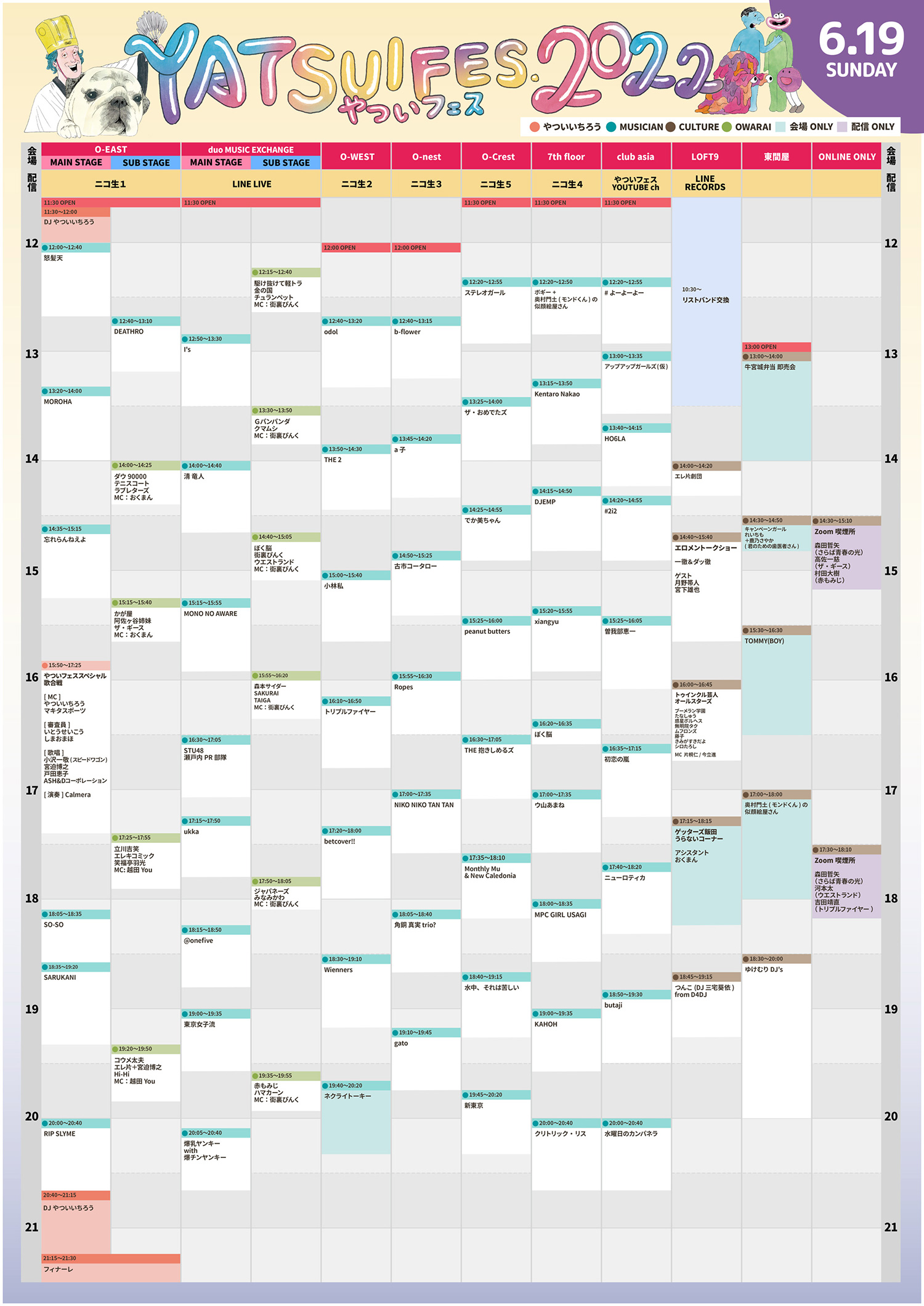 お笑いコンビ「エレキコミック」やついいちろう主催の「YATSUI FESTIVAL! 2022」が、2022年6月18日(土)19日(日)の2日間にわたり開催。当日タイムテーブルと、緊急追加出演者が発表となった。