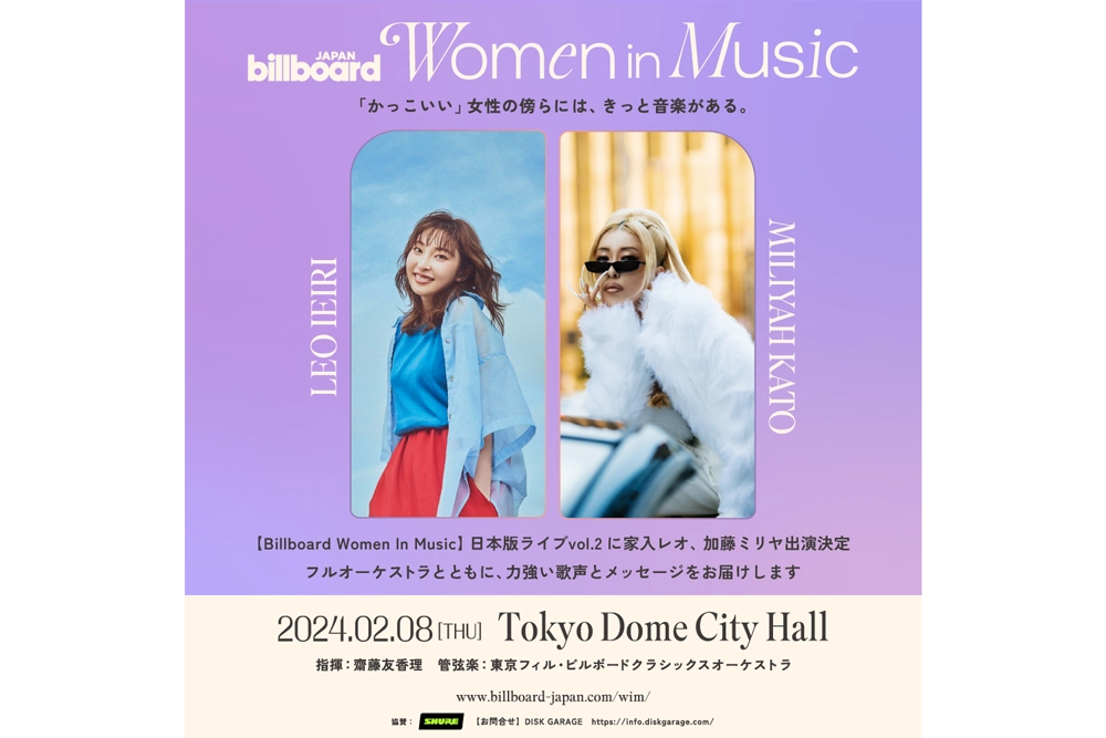 家入レオと加藤ミリヤがフルオーケストラとともに力強い歌声とメッセージを届ける【Billboard JAPAN Women In Music vol.2】が、2024年2月8日に東京・TOKYO DOME CITY HALLで開催される。
