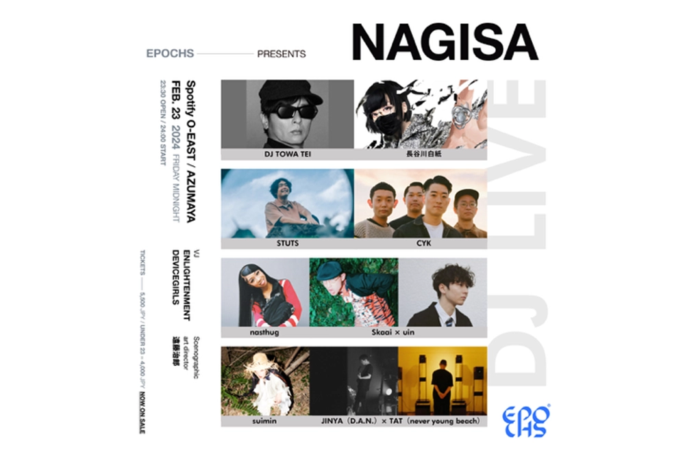 2月23日(金・祝)に開催するオールナイトイベント「EPOCHS Presents NAGISA」のタイムテーブルが発表された。イベントタイトル「EPOCHS Presents NAGISA」の「NAGISA」は、軽井沢での公演で渓流に設けられたエリア名。