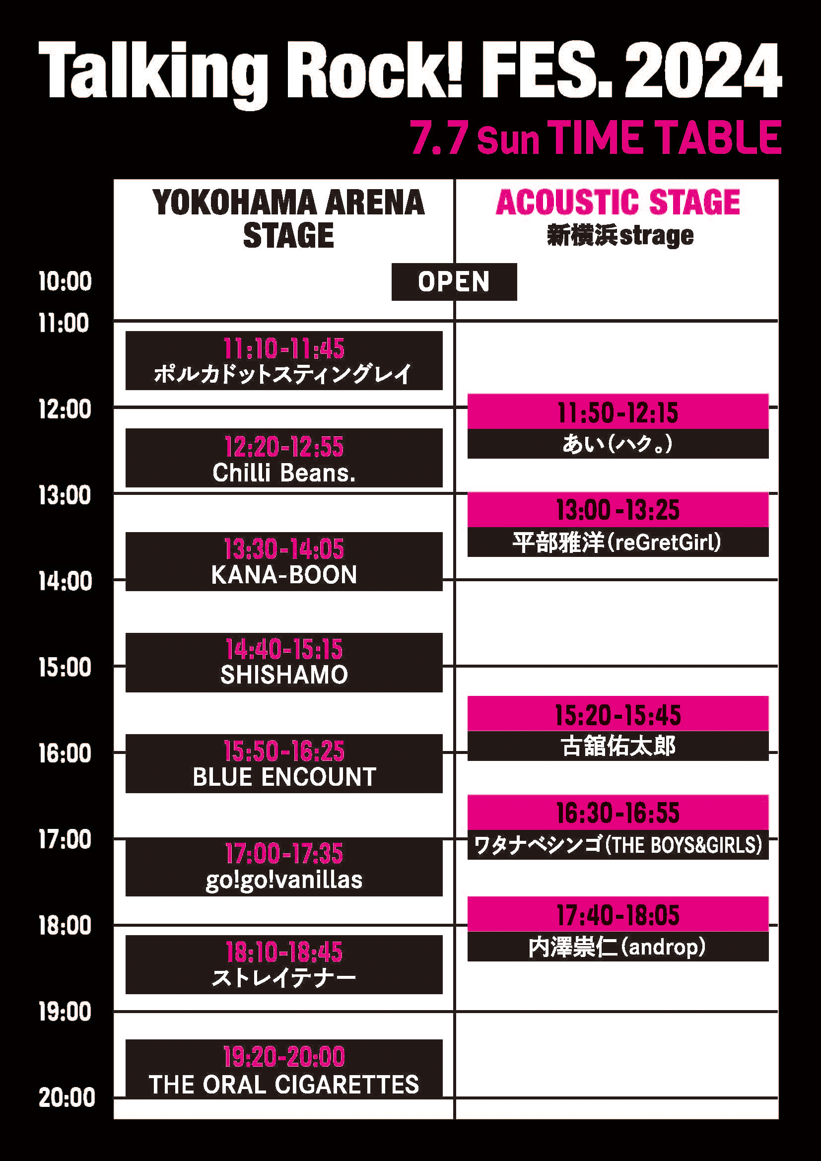 7月6日(土)&7日(日)に横浜アリーナで開催する音楽雑誌「Talking Rock!」の主催イベント『Talking Rock! FES.2024』のタイムテーブルの発表です。今回は同フェス通算10度目の開催を記念して、いつもの“横浜アリーナ”と、敷地内に隣接するライブハウスの“新横浜 NEW SIDE BEACH!!”(7/6)、そしてライブカフェ&バーの“新横浜strage”(7/7)を使用しての2ステージ制で開催。“横浜アリーナ”の1日目はヤングスキニーから始まり、トリはSUPER BEAVERが。そして2日目はポルカドットスティングレイでスタートし、大トリはTHE ORAL CIGARETTESが務めてくれます。2日間ともに演奏時間は被りなしで、購入された1日券でそれぞれ入退場が可能。チケットは1日目が予定枚数を終了しましたが、2日目は絶賛発売中です。2日間で計26組が出演する今夏の『Talking Rock! FES.2024』。みなさんぜひ横浜アリーナに足を運んでください。