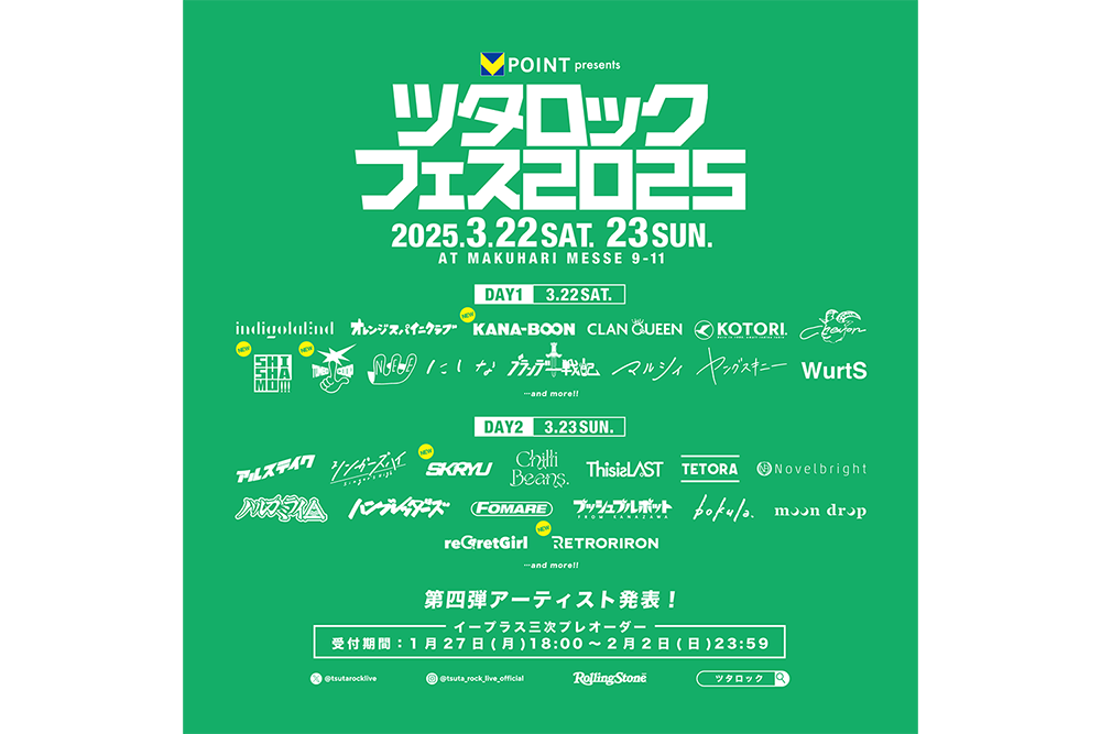 これからの音楽シーンを担う若手アーティストを中心に、今観てもらいたい・聴いてもらいたい・感じてもらいたいアーティストが出演する「Vポイント presents ツタロックフェス2025」の第四弾出演アーティストが発表された。