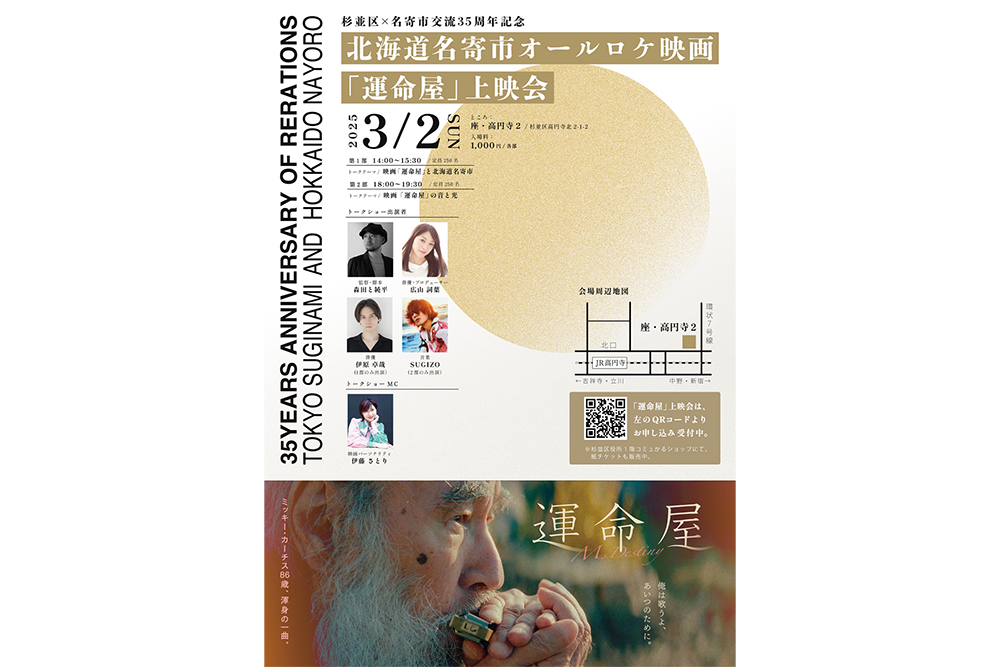 日本にロックをもたらしたミッキー・カーチスの「歌」と「芝居」とをおさめ、世界各地の映画祭を受賞している注目作品・短編映画「運命屋」の特別上映会&トークイベントが3月2日(日)座・高円寺にて開催される。