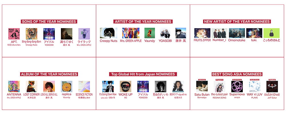 主要6部門では、最優秀楽曲賞256曲、最優秀アーティスト賞167アーティスト、最優秀アルバム賞171作品、最優秀ニュー・アーティスト賞61アーティスト、Top Global Hit from Japan100曲、最優秀アジア楽曲賞24曲の中から、各部門5つずつのノミネート作品/アーティストが決定。エントリー作品に選ばれたアーティスト・クリエイターをはじめとする音楽関係者によってノミネート作品の中から最優秀作品を決定する最終投票も、いよいよ本日より開始する。最優秀作品の決定まで、ご期待いただきたい。
