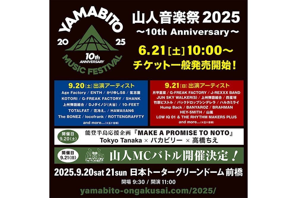 今年、記念すべき10年目の開催を迎える、群馬出身・在住のロックバンド、G-FREAK FACTORY主宰ロックフェス「山人音楽祭2025」が、今年も『山人MCバトル』の開催を発表した。開催日は9月21日(日)。出場者詳細は後日発表となる。尚、山人音楽祭2025の公演チケットは明日6月21日(土)10:00より一般発売開始。まだチケットをお持ちでない方は、是非お早めにお申し込みいただきたい。