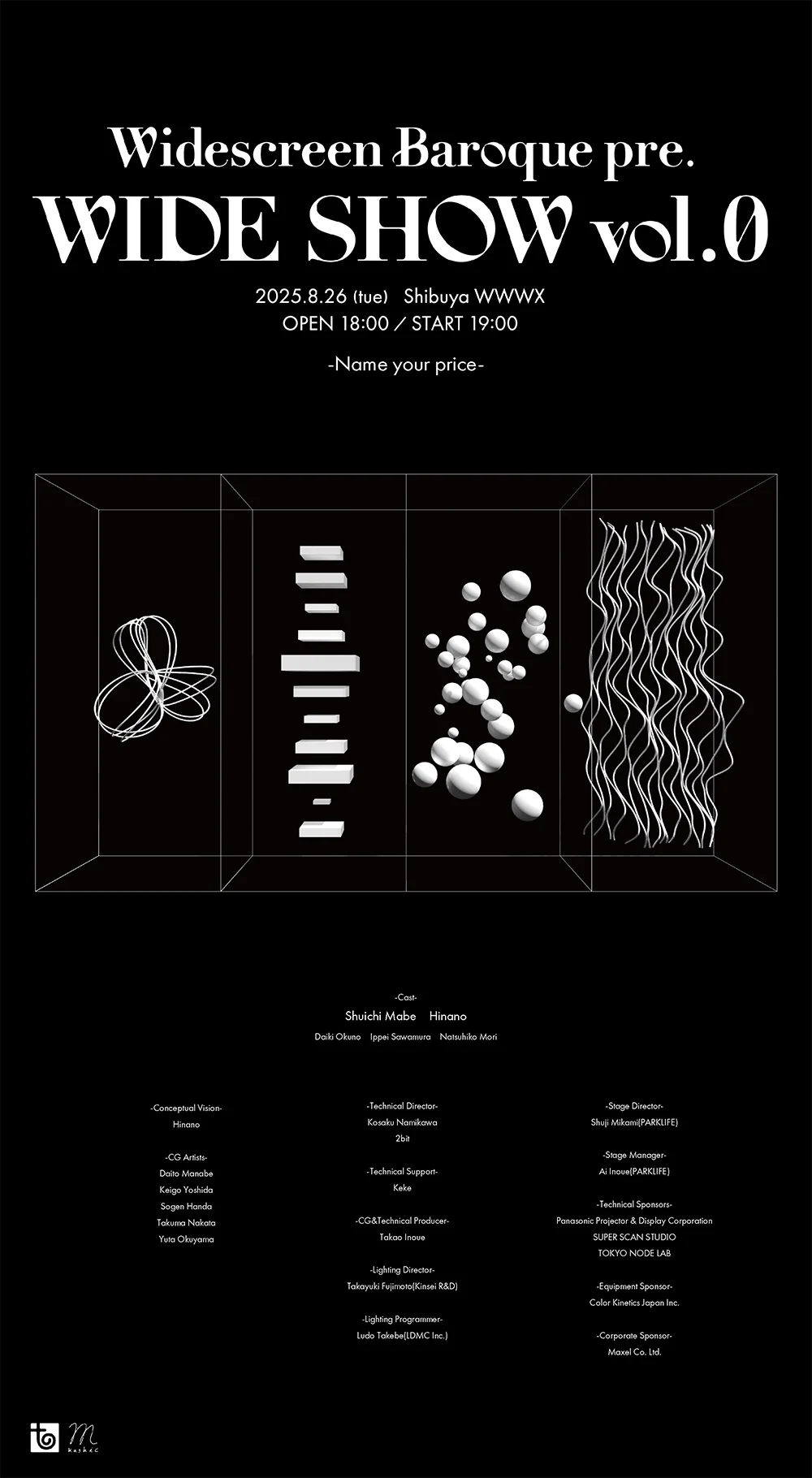 Vocal.HinanoがComposer.真部脩一の音楽から得たインスピレーションをもとに、その世界観を形づくり、多彩な映像作家たちがそのイメージを映像として立ち上げていく。映像制作には真鍋大度、奥山裕大、中田拓馬、半田壮玄、吉田慧悟らが参加。キャリアもスタイルも異なる彼らの映像表現が、真部の音楽と溶け合い、Widescreen Baroqueならではの空間体験が創り出される。