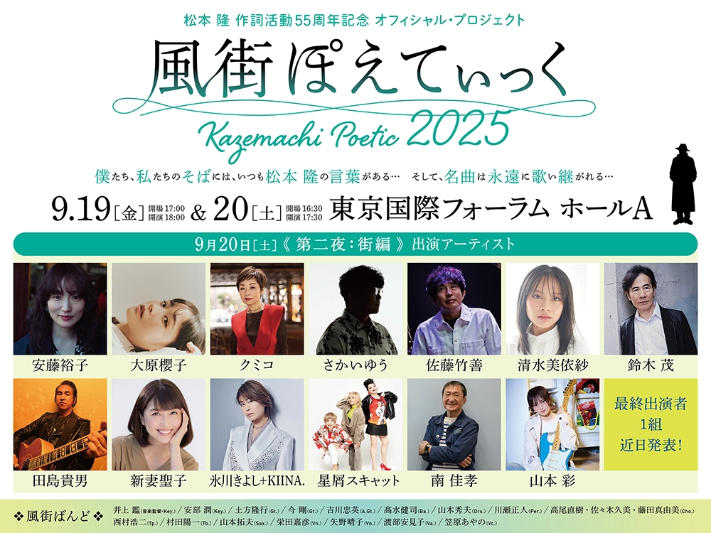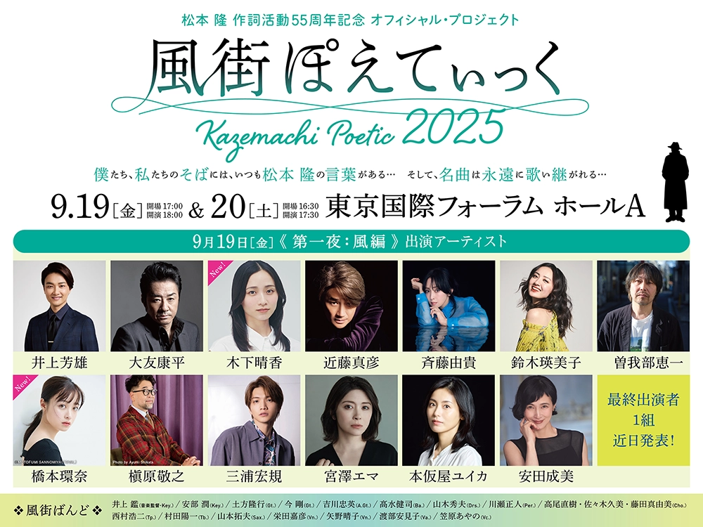 松本 隆の作詞活動55周年を記念し、松本が手掛けた名曲を未来へと「歌い継ぐ」コンサート、オフィシャル・プロジェクト「風街ぽえてぃっく2025」が9月19日(金)20日(土)の2日間、会場は東京国際フォーラム ホールAで開催される。