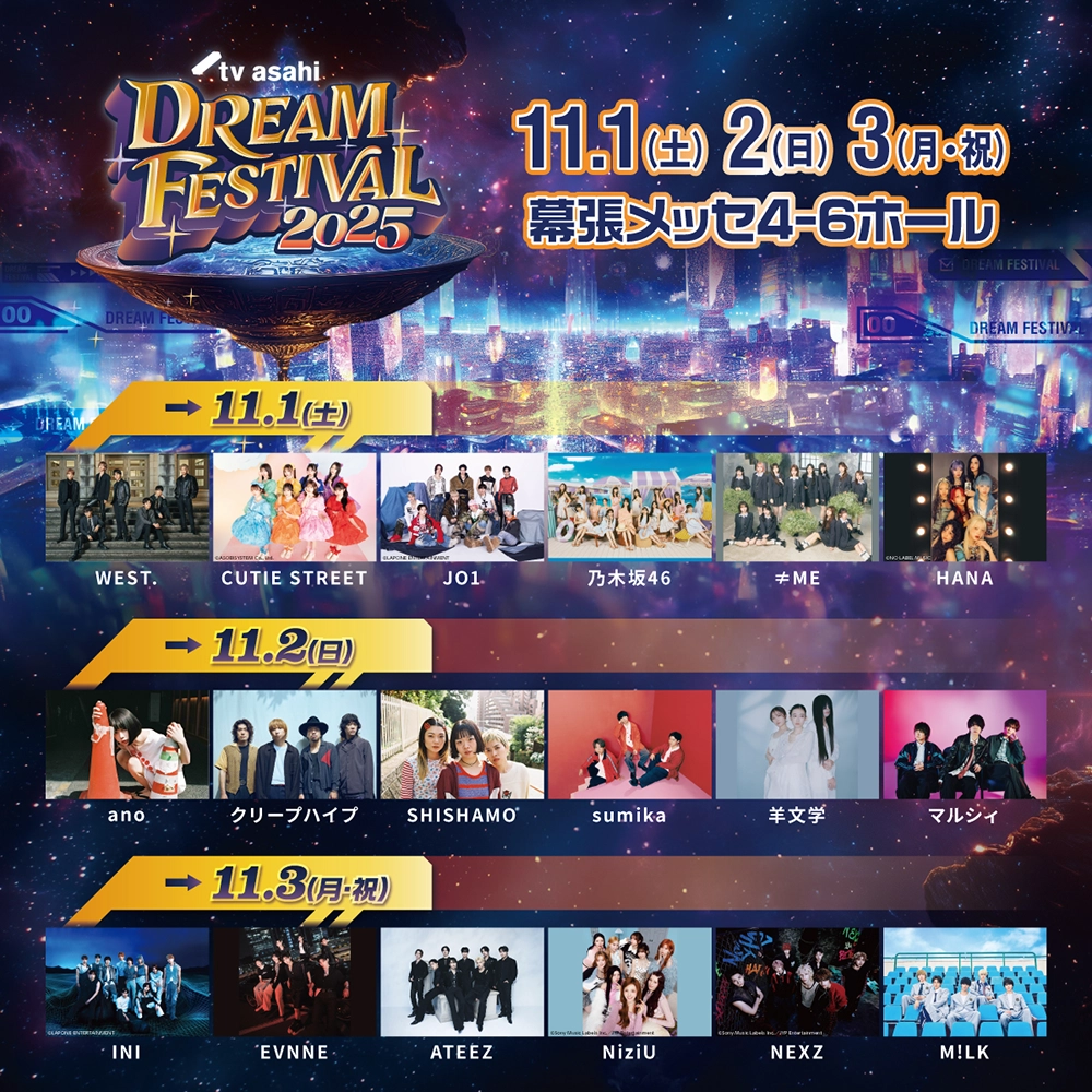 11月1日(土)から3日(月祝)の3日間にわたり幕張メッセに豪華アーティストが大集結する『テレビ朝日ドリームフェスティバル2025』。異なるジャンル・個性を持つ全18組のアーティストが、それぞれの圧巻のステージで会場を沸かせる今年の『テレ朝ドリフェス』は、例年以上に熱く、忘れられない音楽体験となりそうだ。