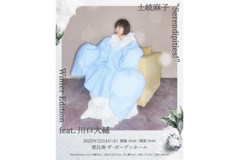 土岐麻子によるスペシャルワンマンライブ「土岐麻子 SPECIAL LIVE “Serendipities!” feat.川⼝⼤輔」の⽇本橋三井ホール公演がソールドアウトにつき、Winter Editionでの追加公演が12⽉4⽇(⽊)に恵⽐寿ザ・ガーデンホールにて開催されることが決定した。