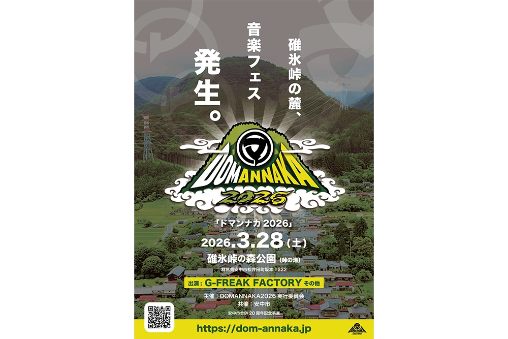 安中市・松井田町の合併20周年を記念した一大イベントとして、今年7月に開催発表をした野外音楽フェスティバル「DOMANNAKA2026(ドマンナカ2026)」。8月に第一弾出演アーティスト発表として、地元を代表するバンド「G-FREAK FACTORY」を発表し、SNSなどで大きな反響を呼んだ。そしていよいよ、10月19日(日)正午より、チケット販売がスタート。今回のチケット販売は、第1次先行販売として、チケットならぬ通行手形と、300枚限定の駐車場付き通行手形の販売を行う。オフィシャルサイト上で、アクセスに関する情報などもアップデートされているので、チェックしてほしい。