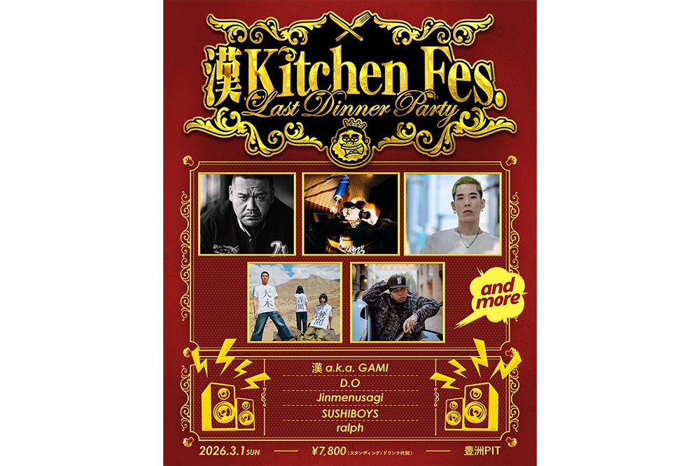 3月に番組終了を発表している、漢 a.k.a. GAMIがMCの料理番組「漢 Kitchen」番組のフィナーレを飾るイベント「漢 Kitchen Fes. ~Last Dinner Party~」が豊洲PITにて開催決定。