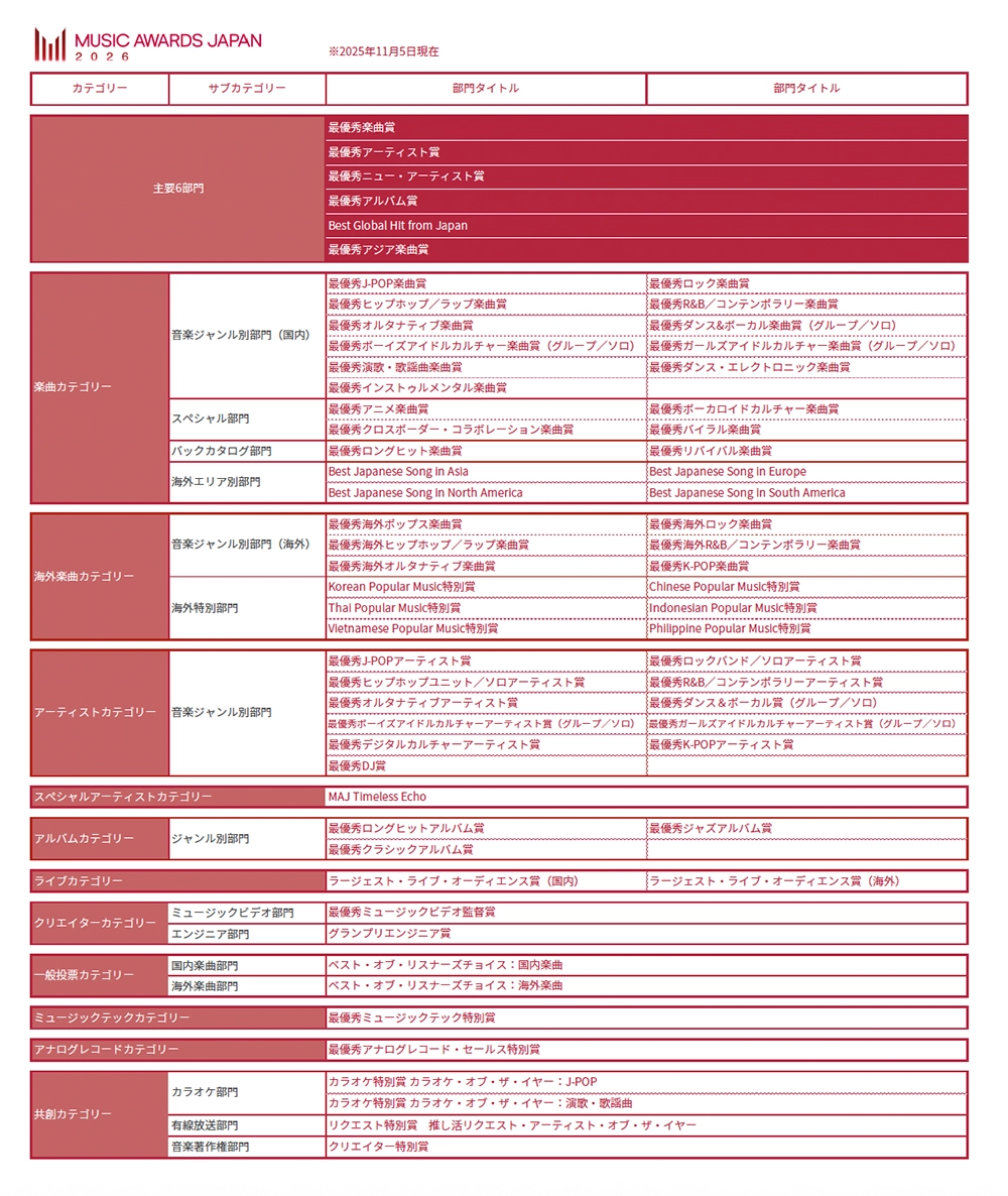 MAJ2026では、MAJ2025に引き続き、最優秀楽曲賞、最優秀アーティスト賞、最優秀ニュー・アーティスト賞、最優秀アルバム賞、Best Global Hit from Japan、最優秀アジア楽曲賞の主要6部門を設ける。さらに、MAJ2025から部門を再設計の上14部門を新設、日本そして世界の音楽シーンを彩る多様なカルチャーに合わせた約70の部門を創設。