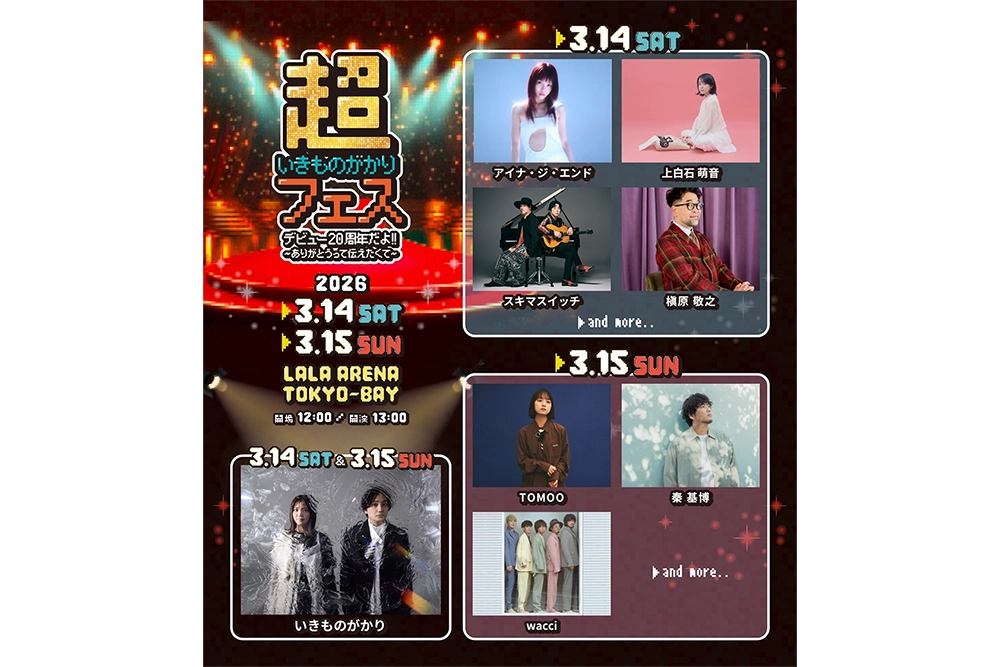 いきものがかり自身初となる主催フェス《超いきものがかりフェス デビュー20周年だよ!! 〜ありがとうって伝えたくて〜》の第1弾アーティストとして発表したアイナ・ジ・エンド、上白石萌音、スキマスイッチ、TOMOO、秦 基博、槇原敬之、wacciらの出演者日割りを発表した。