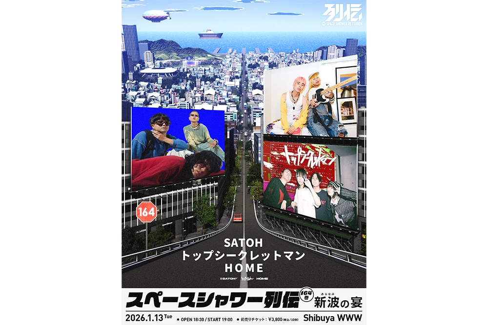 この25年の間に音楽シーン、音楽を取り巻く環境も大きく様変わりした中で、これから出会う新たなリスナー、新たなアーティストたちと共に歩むためにもスペシャ列伝は節目を目前に準備期間の約1年を経て再始動する。スペシャ列伝が立ち上がった当初から変わらない“ライブ”という熱量と、ライブを通してアーティストの本質を伝えるという役目を担いながら走り続ける、その決意のスペシャ列伝 第164巻 –新波の宴-にSATOH、トップシークレットマン、HOMEの3組が出演。それぞれ異なるシーンで存在感を放つ3組が来年1月13日(火)Shibuya WWWで新しい波を起こす。