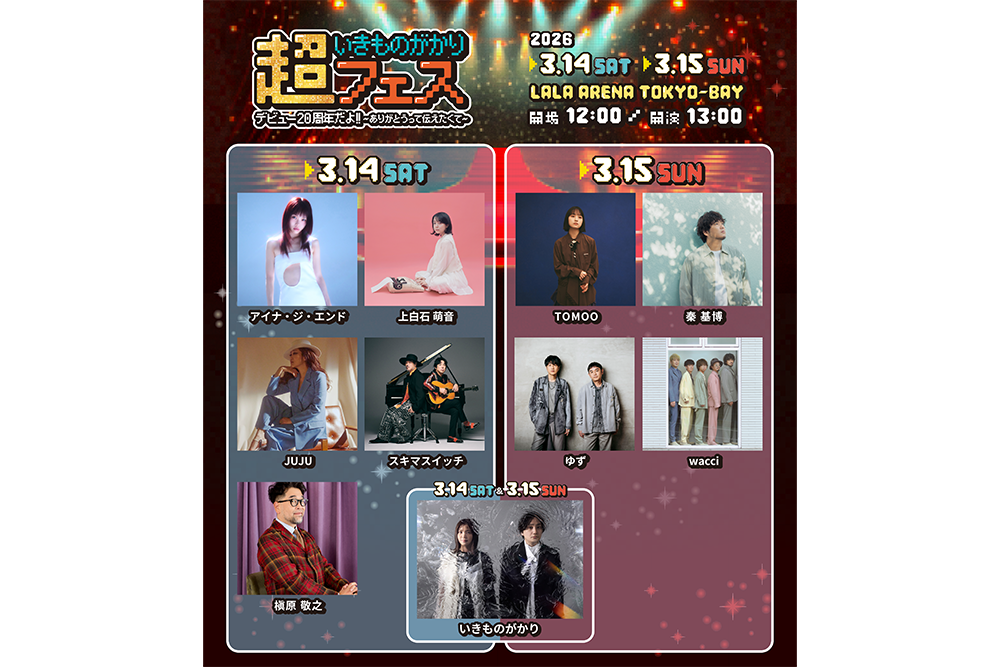 いきものがかり自身初となる主催フェス 《超いきものがかりフェス デビュー20周年だよ!! 〜ありがとうって伝えたくて〜》 にJUJU、ゆずの出演が決定した。