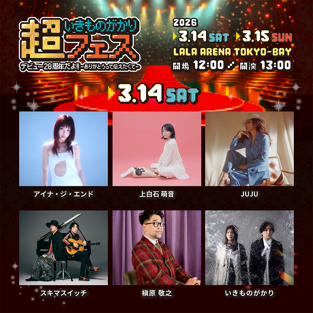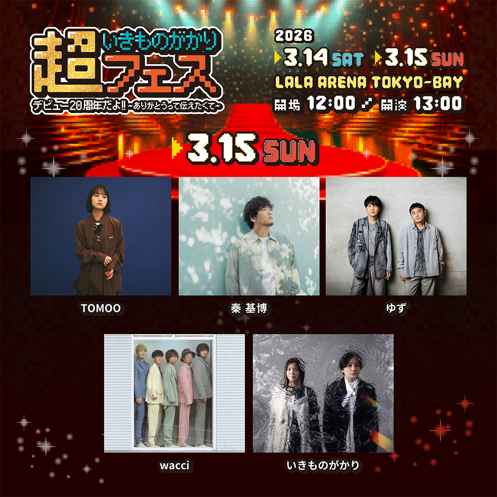 [DAY 2]3月15日(日)いきものがかりの20周年をお祝いに、両日共にいきものがかりと関わりのある豪華アーティストがLaLa arena TOKYO-BAYに集結する。いきものがかり、豪華アーティスト、そしてお客様全員で2日間限りの特別な時間を、会場で過ごしていただきたい。