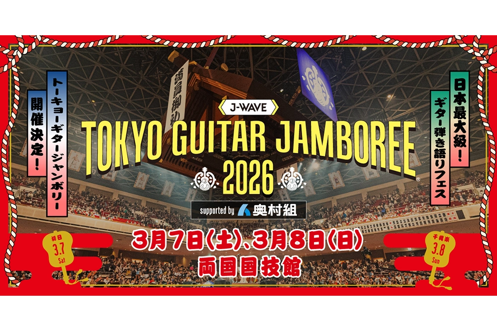 ラジオ局J-WAVE(81.3FM)は、2026年3月7日(土)・8日(日)の2日間、、豪華アーティストが共演する、毎春恒例のギター弾き語りの祭典「J-WAVE TOKYO GUITAR JAMBOREE 2026 supported by 奥村組」を、両国国技館にて開催する。