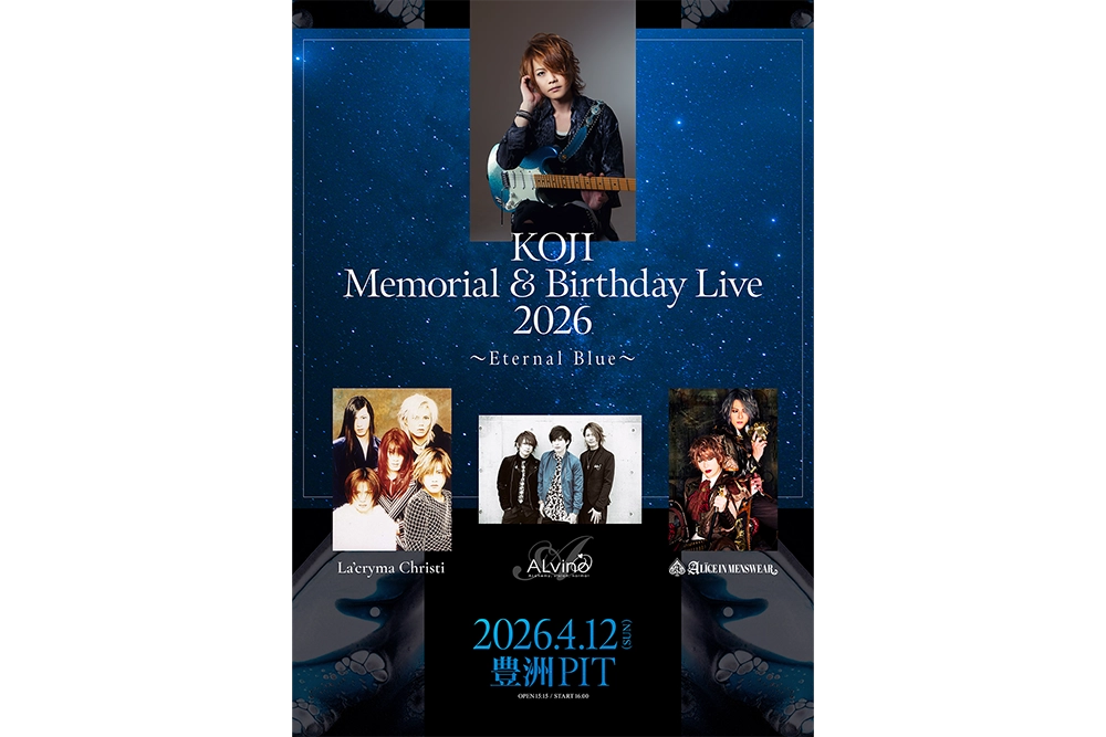 KOJIの所属した3バンドでイベントを行うのは今回が初の試み。2025年11月より期間限定再始動中のラクリマ、同じく11月に“奇跡の復活”として2026年MASCHERAとの2マンを発表したALICE IN MENSWEAR、約2年振りにメンバーとKOJIの音とが邂逅するALvino。音楽性はそれぞれ違うもののKOJIが遺した多彩な楽曲と彼への“愛”を持ち寄り共演する。機材マニアでもあるKOJIが各バンドで使用した楽器を見られるチャンスともいえそうだ。逝去から4年を経て実現するメモリアルライブで、永遠に輝き続けるKOJIの音楽を堪能できる。