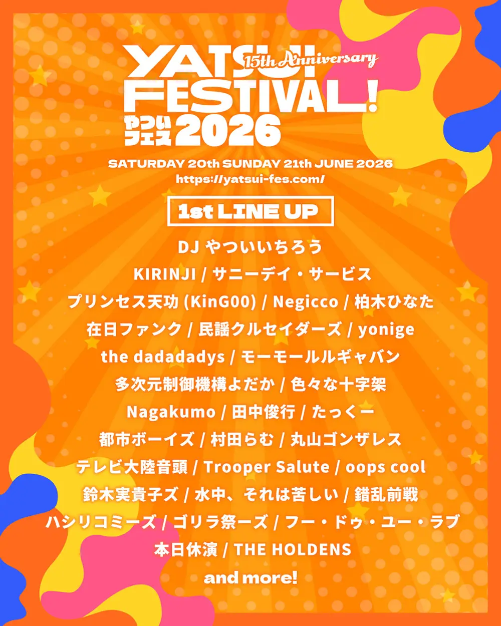 お笑いコンビ「エレキコミック」のやついいちろうが主催する音楽とお笑いのエンタテインメントフェス「YATSUI FESTIVAL! 2026」を、来年2026年6月20日(土)・6月21日(日)の2日間にわたり開催される。このたび第1弾発表として、以下の30組が発表された。