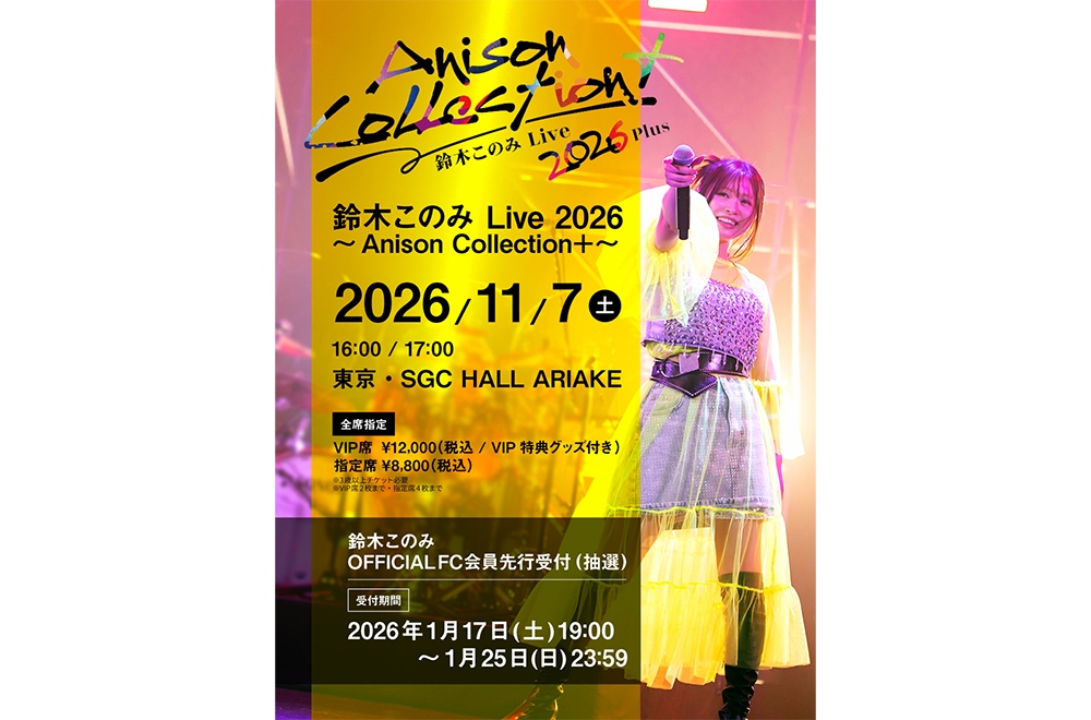 デビューしてから現在まで歌唱してきたアニソン主題歌のみで構成されるアニソンオンリーライブ「鈴木このみ Live 2026 ~Anison Collection+~」は、本日19時より鈴木このみFCサイトにて最速先行の受付がスタート!