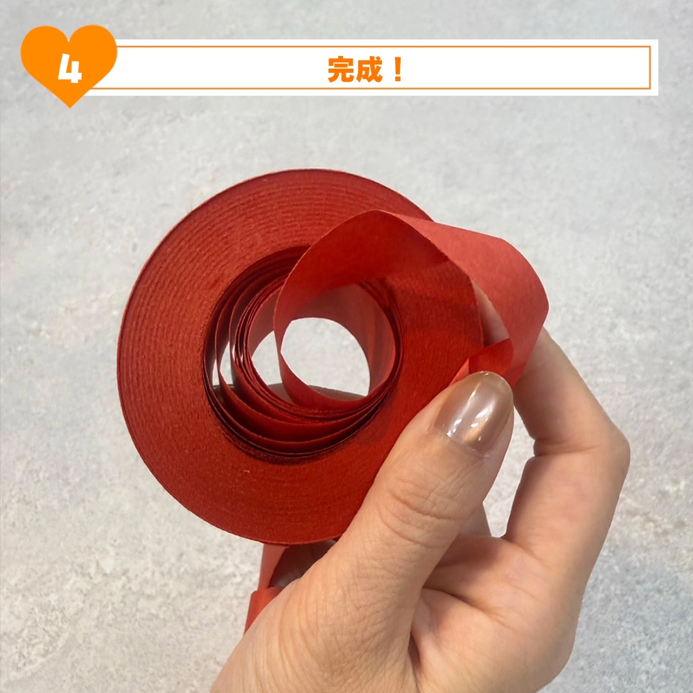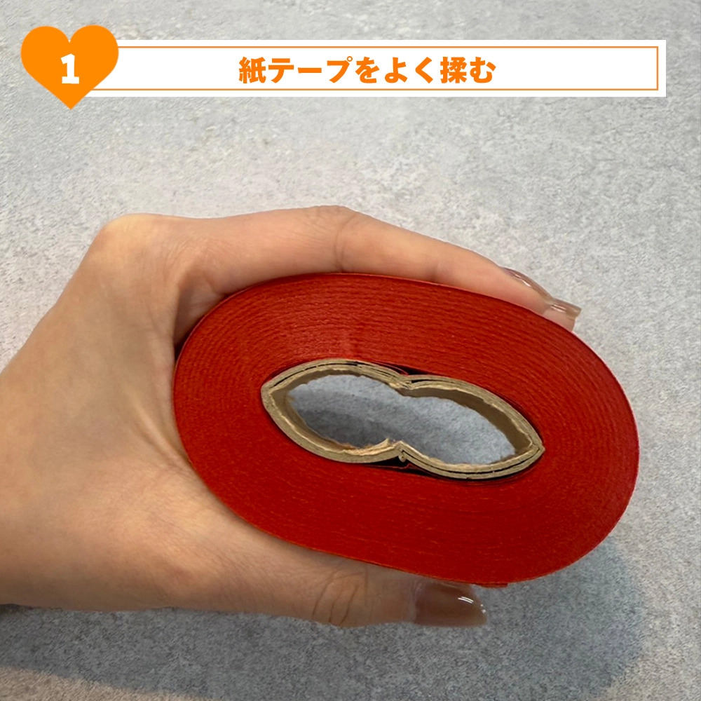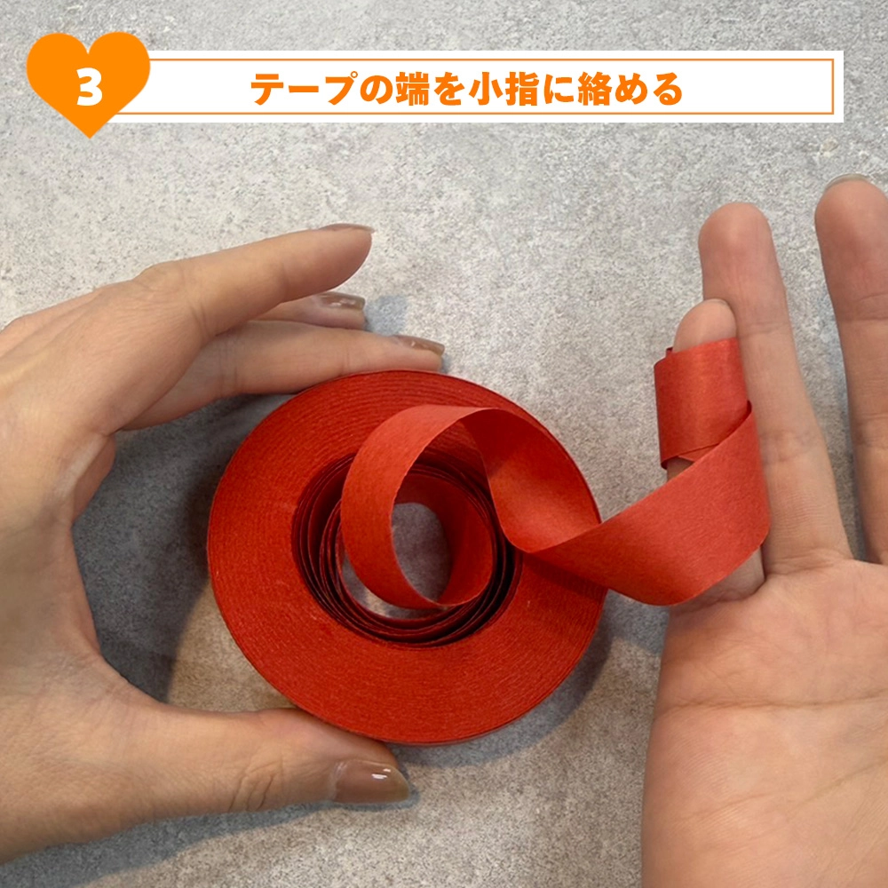 ③芯をちぎり、切り離された紙テープの内側の端を投げる手の指に絡めます。