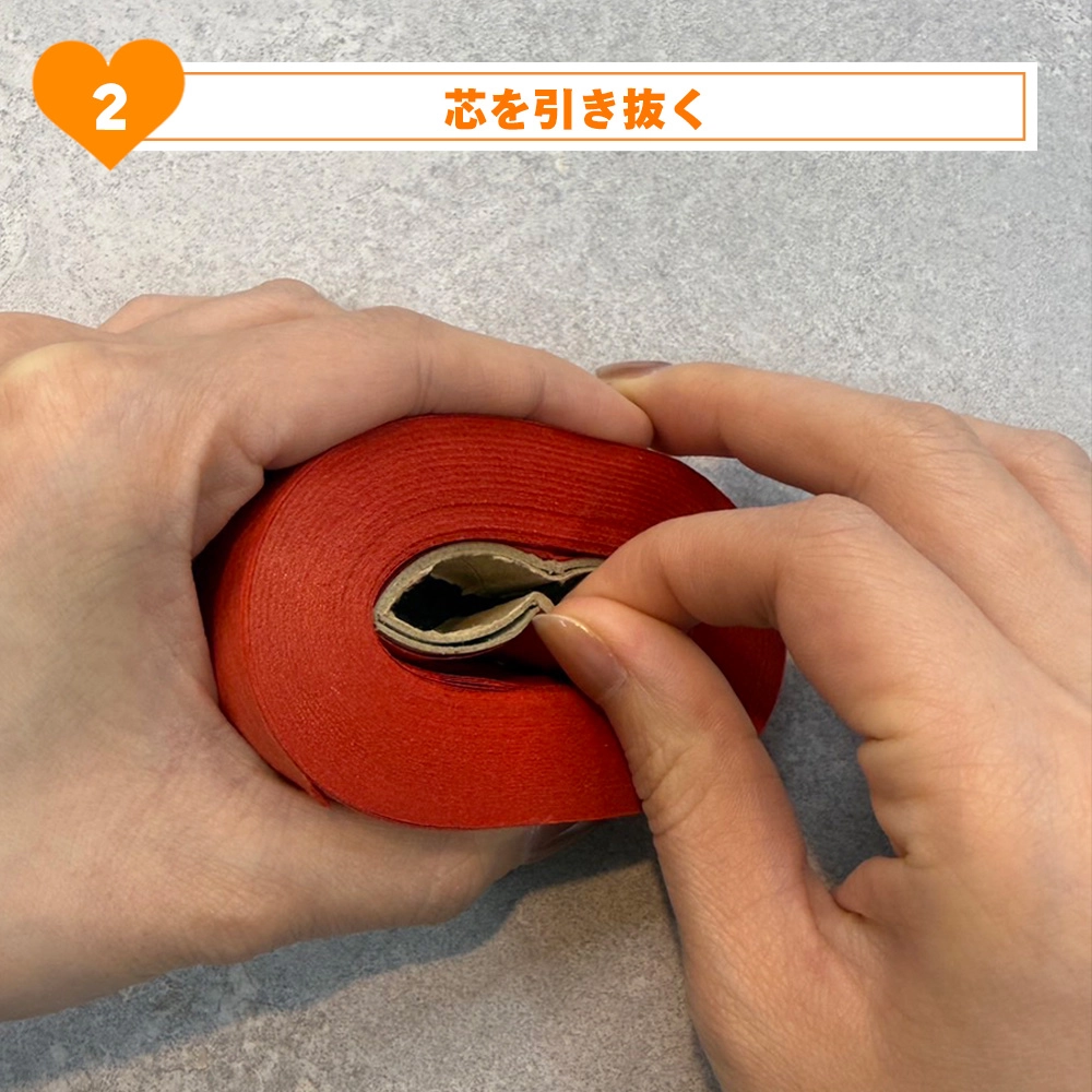 ②テープと芯の間に隙間ができてきますので、そこに指の爪を差し込んで芯を引っ張り抜きます。