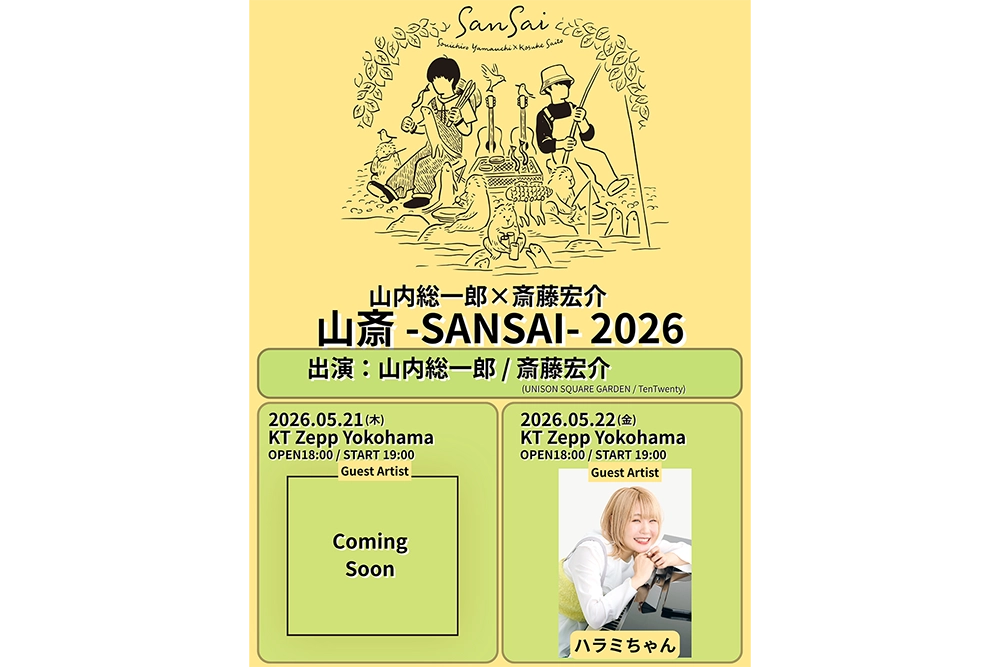 山内総一郎と斎藤宏介(UNISON SQUARE GARDEN/TenTwenty)のユニット「山斎」が5/21(木)、5/22(金)KT Zepp Yokohamaにて開催する「山内総一郎×斎藤宏介 山斎-SANSAI-2026」、2日目となる5/22(金)のゲストアーティストとしてハラミちゃんの出演が決定。