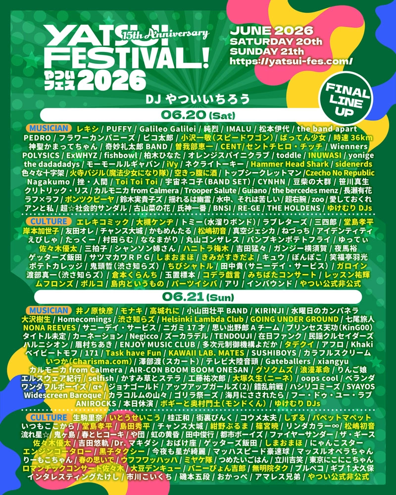 お笑いコンビ「エレキコミック」のやついいちろうが主催する音楽とお笑いのエンタテインメントフェス「YATSUI FESTIVAL! 2026」が、2026年6月20日(土)・6月21日(日)の2日間にわたり開催される。このたび最終出演者67組が発表された。