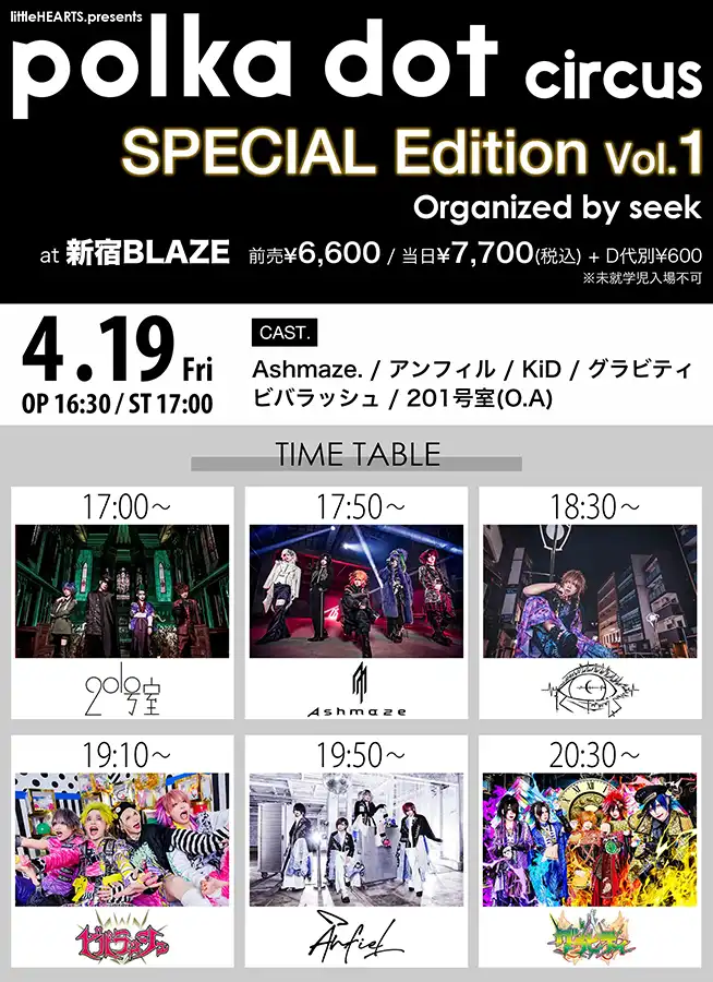 ヴィジュアル系専門CDショップ・littleHEARTS.主催の人気イベント「polka dot circus」シリーズが「polka dot circus SPECIAL Edition Vol.1」となって、4月19日(金)、東京・新宿BLAZEで開催される。今回も、オーガナイザーはPsycho le Cémuのseekが担当。現在新世代台頭で、新たなフェーズに突入しているヴィジュアルシーンのことをもっと知りたいということで、今回はseekの元にイベント出演バンドが集結。Ashmaze.の詩結(Gt)、アンフィルの翔梧(Vo)、KiDの楓(Gt)、グラビティの六(Vo)、ビバラッシュのるいまる(Vo)を迎え、現在のヴィジュアルシーンで話題を集める彼らの魅力、今回のイベントにかける抱負、見どころについてseekとともに話を聞いた。次世代のヴィジュアルシーンを牽引する彼らをマークするにはぴったりのイベントなので、これを読んで、ぜひ当日は会場に駆けつけて欲しい。