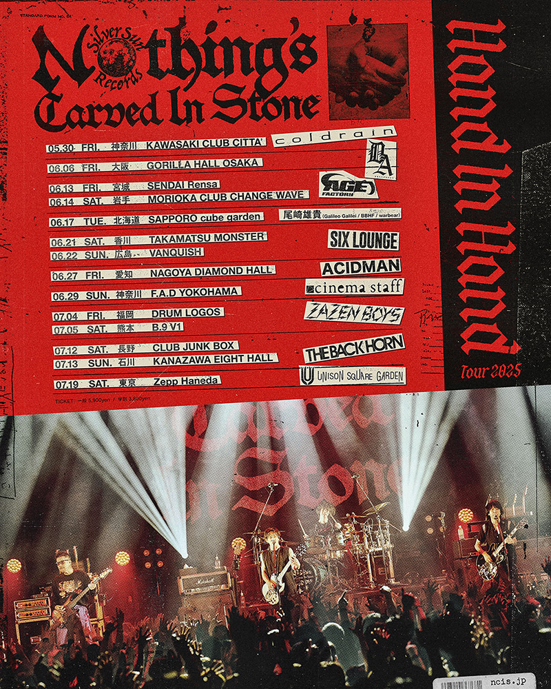 昨年2月、結成15周年を記念し、リクエスト含む30曲を超える濃厚なセットリストで日本武道館公演『15th Anniversary Live at BUDOKAN』を行なった、Nothing’s Carved In Stone。ひとつの集大成を見せたのちも、その歩みを止めないバンドの姿をEP『BRIGHTNESS』へと鮮やかに織り上げ、また初のフィーチャリング曲「All We Have feat. Masato(coldrain)」をリリースしと、進化/深化を続けている4人が、2023年以来となるツーマン・ツアー『Hand In Hand Tour 2025』を5月30日(金)よりスタートする。初の顔合わせを含め全国全14公演・10バンドのライブ猛者を揃えたツアー、このラインナップにも今のバンドの前のめりな姿勢が見てとれる。インタビュー後編ではツアー後半の出演バンドのエピソードのほか、5月14日(水)に配信リリースとなる新曲「May」についての話を、村松 拓(Vo/Gt)、生形 真一(Gt)のふたりに聞いた。
