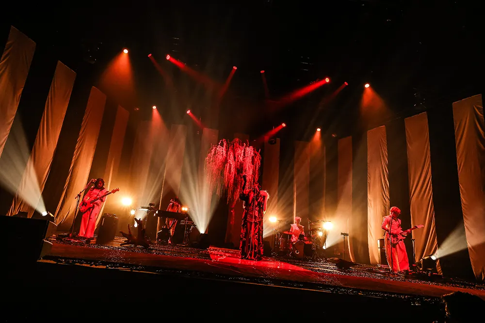 19時ちょうどに会場が暗転。暗闇の中で拍子木の“カーン”という音が響く。ステージの幕が上がると、そこには白装束に身を包んだメンバー(アヴちゃん(Vo)、やしちゃん(Ba)、ひばりくん(Gt)とサポートメンバーのながしまみのり(Key)、山口美代子(Dr)の姿が。背中を向けて立っていたアヴちゃんは曲がはじまると同時に正面を向き、狂おしいまでに美しい歌声を響かせる。1曲目は「FLAT」。楽曲の後半〈単館系ジェンダームービー/主人公は病むか死ぬか恋に敗れるか/ちょっと判んないね〉というフレーズをアカペラで歌い上げ、グッと心を掴まれる。白黒の鯨幕、枝垂柳をモチーフにしたオブジェを含め、ステージ全体に透き通った霊性が漂っている。
