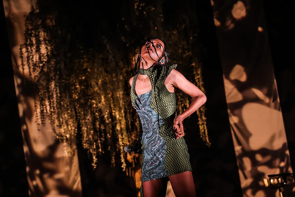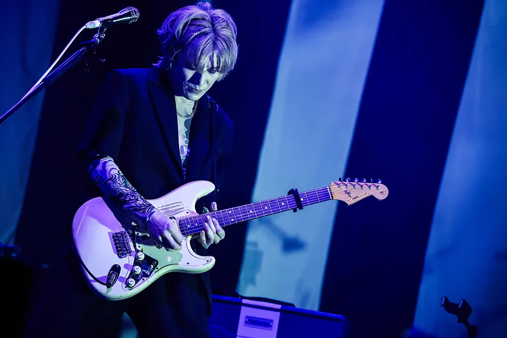 ここでアヴちゃんがステージ袖に引っ込み、バンドメンバーは「ハイになんてなりたくない」を演奏。ブルーのスパンコールのミニワンピ、ゴージャズな着物のようにも見えるガウンを羽織ったアヴちゃんがステージに戻ると、「02」からライヴの後半をスタートさせた。間奏では祭囃子的な音が加わり、「お嬢さんお入なさい」と歌う場面ではマイクのコードを大繩のように回してみせる。ひときわ強い目線を客席に放ち、「まかしとき」(アヴちゃん)という煽りから始まったのは「MYSTERIOUS」。3拍子のジャジーなアレンジとともにしなやかなメロディを描き出すアヴちゃんは豊かな官能性をまといはじめる。