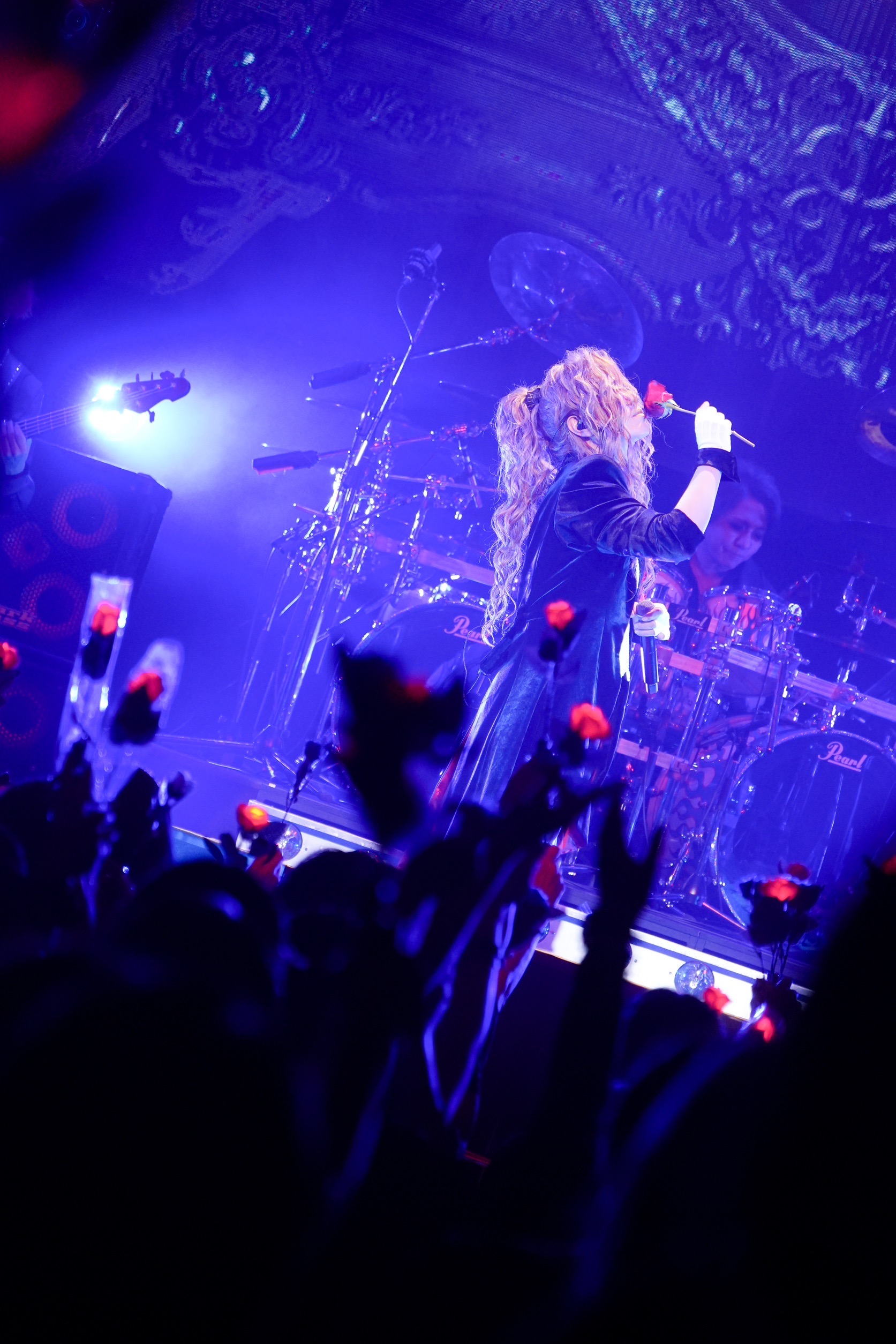 物語がアメリカに渡ったところで、曲調もガラリとモダンなものに変わり、ヘヴィなギターとデジタルなダンスビートを融合させた「Conspiracy」が立ち上がると、そのサウンドに合わせて、LED画面にもデジタルな世界が広がっていく。そうして、メロスピな「Eye of Providence」へと曲が展開すると、バンドサウンドが今度はオーケストラのようにからみあい、メランコリックな旋律を奏で始める。KAMIJOはその上で、全編英詞の歌詞をファルセットを使った繊細な歌いまわしで歌唱してく。スローな幕開けから、サビはバスドラが激しくドコドコ鳴り響くまでテンポアップするこの曲は、この後そこにHIROがスピード感あるギターソロをつないで、物語の展開をさらに加速させていく。このあとは、ここまでの物語がフラッシュバックするようなセリフのサンプリングに続いて、始まったのはこの日のためにバラードへと生まれ変わった「OSCAR」だった。“百合の名と青い血と王の誇りにかけて”とルイ17世と自身のヒストリーにもかけた歌詞を、KAMIJOがドラマチックに歌い上げていく。ここからライブは後半のハイライトへと向かっていく。