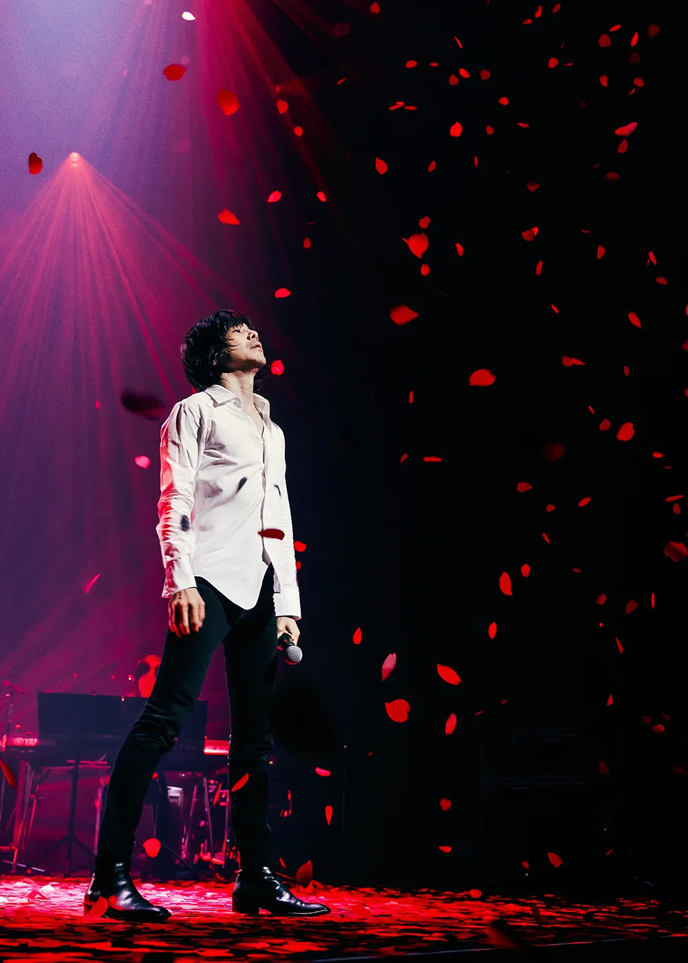 三部のフィナーレに演奏されたのは、宮本のソロとしての初シングル曲「冬の花」だ。オリジナル曲ではあるが、一連の歌謡曲カバーの起点となった曲でもあるだろう。“花の儚さ”と冬に咲く“花の強靱さ”とが混ざり合った、歌謡曲の要素とロックの要素とが融合した曲でもあるからだ。花びらが舞うような照明の演出に続いて、赤い紙吹雪が舞う中での歌。曲が展開するほどに、歌からもバンドの演奏からも、生命力のきらめきと表現したくなるような、エネルギーがほとばしっていく。全員がステージから去ったあとに、拍手の中、メンバーが再登場して、宮本が挨拶した。「尊敬する素晴らしい仲間と五人衆でお届けしてきました。お互い、幸せだね、コンサート」という言葉に続いて、最後の曲は沢田研二の「サムライ」だった。この曲の持っているハードボイルドなタッチと宮本の歌声とが見事にマッチしていた。<俺は行かなくちゃ いけないんだよ>という歌詞など、宮本が書いてもおかしくない。宮本には旅立ちの歌が似合っている。