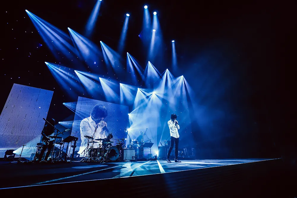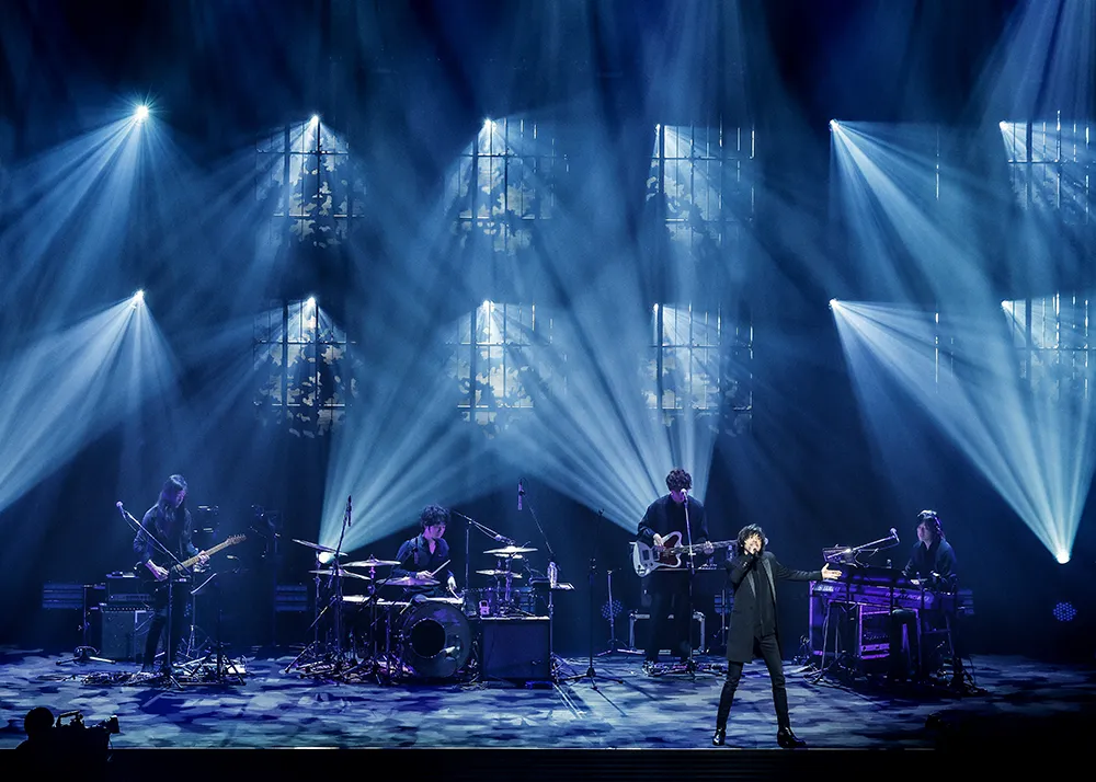 星々の光が街に降り注ぐような映像が映し出されて、コンサートが始まった。『ロマンスの夜』という名のファンタジーへの入り口の曲は「ジョニィへの伝言」だ。ピアノが一音鳴り、アカペラで宮本が歌い出す。ステージ上だけでなく、会場内の観客全員の集中力を高めるような始まり方だ。宮本が歌い出した瞬間に、優美かつ繊細な歌声に引き込まれた。そしてそのボーカルを支えるような、ニュアンス豊かなバンドの演奏が始まると、歌の物語がゆったりと動き出していく。バンドのメンバーは小林武史(Keyboards)、名越由貴夫(Guitar)、須藤優(Bass)、玉田豊夢(Drums)。それぞれのポジションが宮本を囲むように近くに設定されている。宮本の歌声には、せつなさだけでなく、開放感も漂っている。『ロマンスの夜』の始まりにふさわしく、旅立つ主人公の清々しさまでもが伝わってくるようだった。