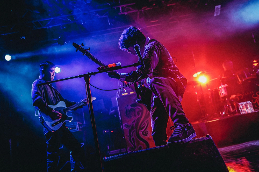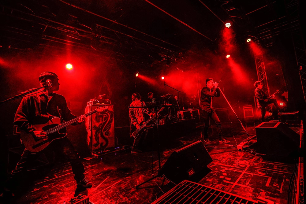 KEN LLOYD(Vo)がそう挨拶し、放たれた「Searchlights」はどこまでも広がっていくサウンドスケープとKENのヴォーカルに恍惚感すら覚える完成度だ。後半では息を合わせるようにドラムのARIMATSUの前にRIKIJIとKENが集結した。間髪入れずキラーチューンが連続投下。K.A.Zのギターリフで始まり、KENが「COME ON!」と煽った「Under My Skin」は痛快そのもの。RIKIJI(Ba)の骨太なベースがフィーチャリングされ、フロアがジャンプする中、KENが水を撒き散らす。場内は沸騰状態。KENがローからファルセットまで声を使い分けて魅了する「Crawl」でさらに火をつけ、「Syndrome」ではシンガロング。K.A.Zがドラム台に上がり、RIKIJIがベースのネックを高く掲げた。