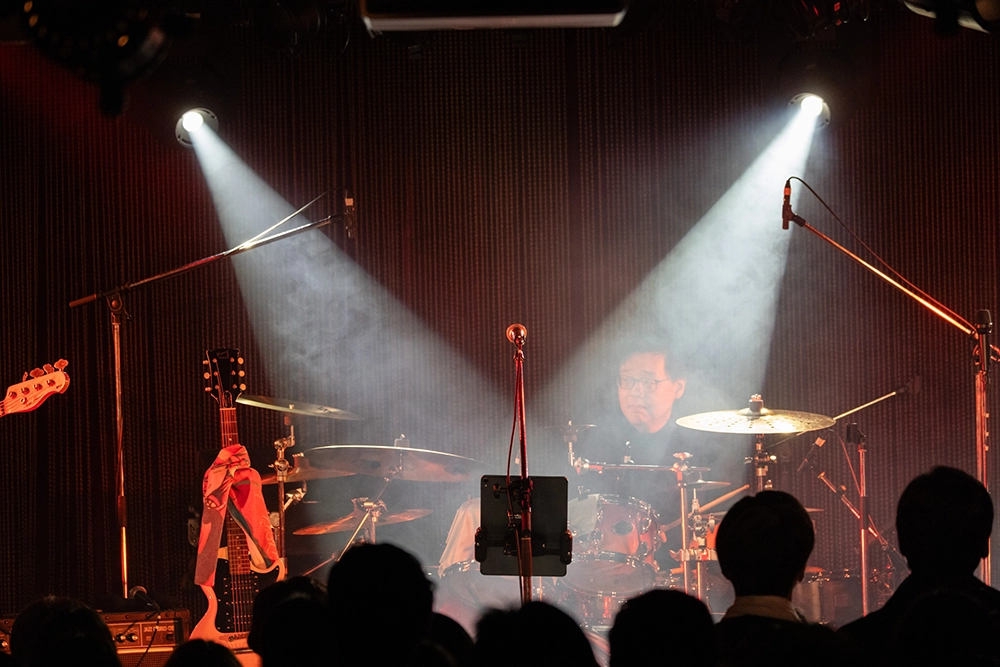 そして、6曲目からラストまでのドラマーは、テディ。HAZEからテディにスイッチする時、ドラムセットの転換をする間は、フロア左横のスクリーンを使って、空想委員会と仲間のバンドたちの、歴代のオフショットが公開され、それを見てメンバー+ゲストで当時の思い出話をする、というコーナーでつなぐ。