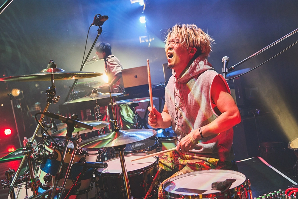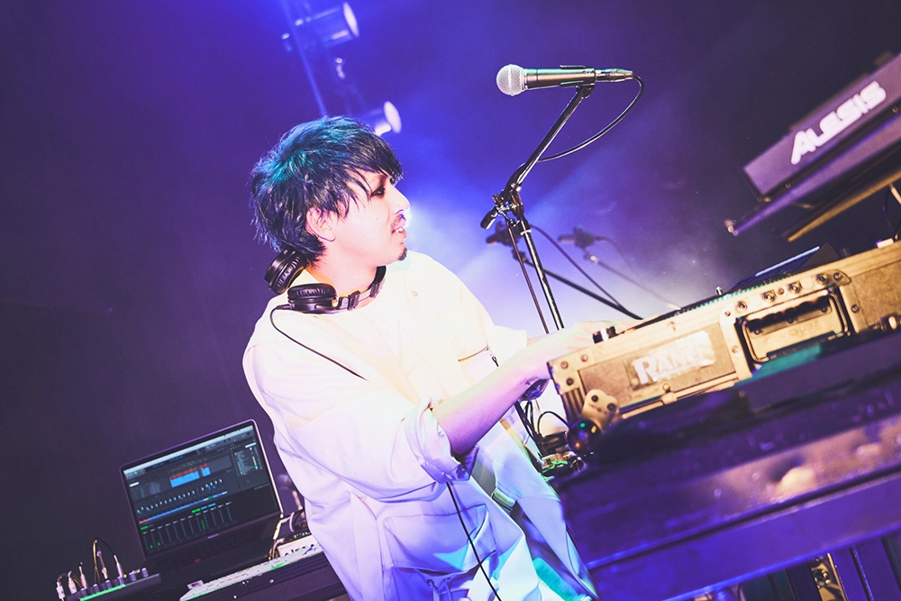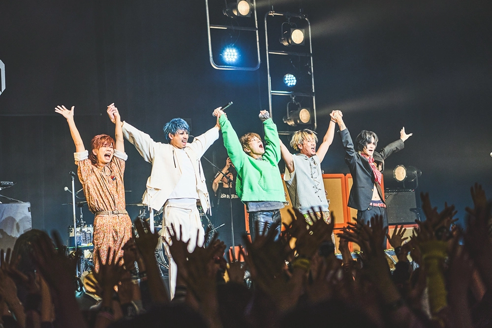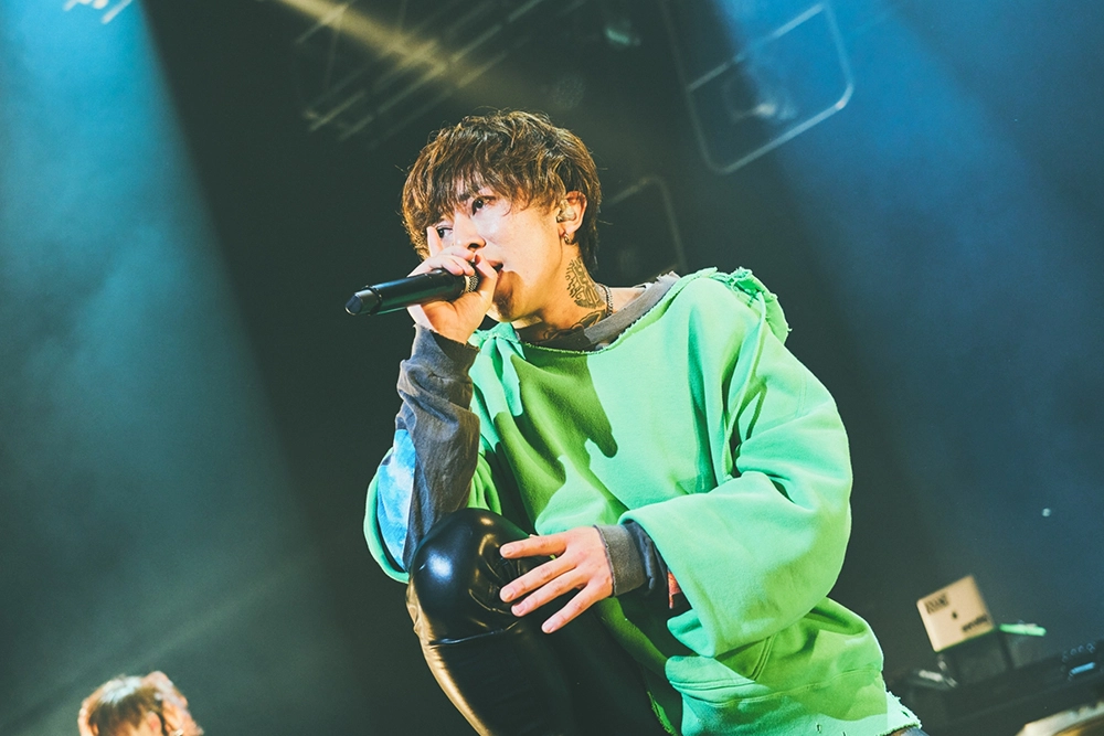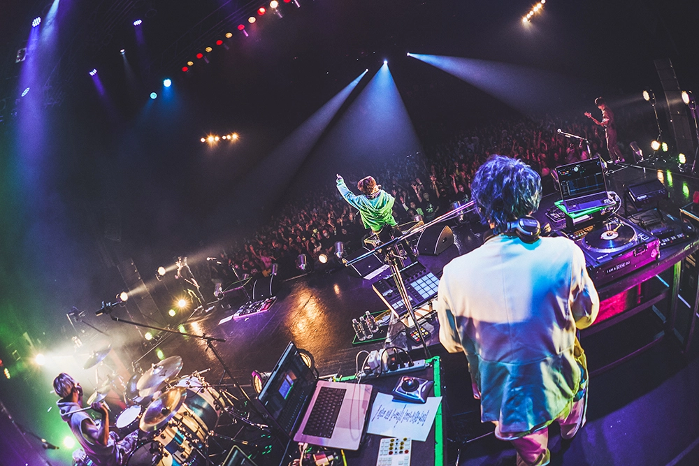 ミラーボールの光の下、ムーディーな演奏と切なく色気ある歌声が会場を包んだ「Stigma」、ヘヴィなサウンドに強いメッセージを放つ「新世界」と続き、突き上げるダンスビートでフロアを踊らせた「デカダンス」ではASHとNarukazeがフロアに飛び込んだりと、彼らの幅広い音楽性や高いスキル、多面的な魅力で魅せた中盤戦。「Super Sonic」のWANIとDhalsim(DJ)の白熱のセッションから、Sato(Ba)~Narukazeのソロで始まり、ASHがキレキレのラップを聴かせた「エントロピー」でメンバーそれぞれの魅せ場も作ると、「白昼夢」や「金木犀」では切なく温かみある世界観を5人で丁寧に構築し、「Calling you」は壮大な演奏に乗せて愛を歌う、ASHの真っ直ぐで伸びやかな歌声が胸に迫る。