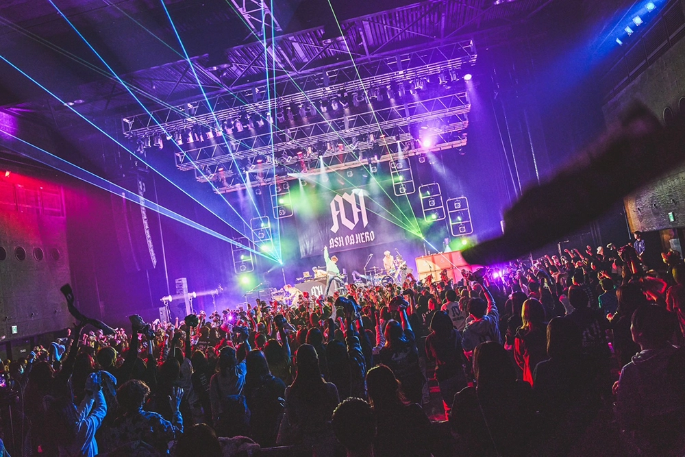 闘魂みなぎるOPナンバーでオーディエンスの心に火を着けると、「ペルソナ」、「自分革命」とツアーで鍛え上げた『HUMAN』収録の新曲が続き、フロアを大いに沸かせた序盤戦。WANI(Dr)の軽快なビートに楽器隊が演奏を重ね、「明けましておめでとうございます!俺たちが令和最強のロックバンド、ASH DA HEROです」とASHが挨拶。「今日はファイナルであり、2024年のライブ始めです。集まってくれたみんなじゃなくて、一人ひとりと最高のロックンロールショーを作って行きたいと思います」と告げ、Narukaze(Gt)のギターで始まった「Avengers」の痛快なロックンロールで会場を揺らす。