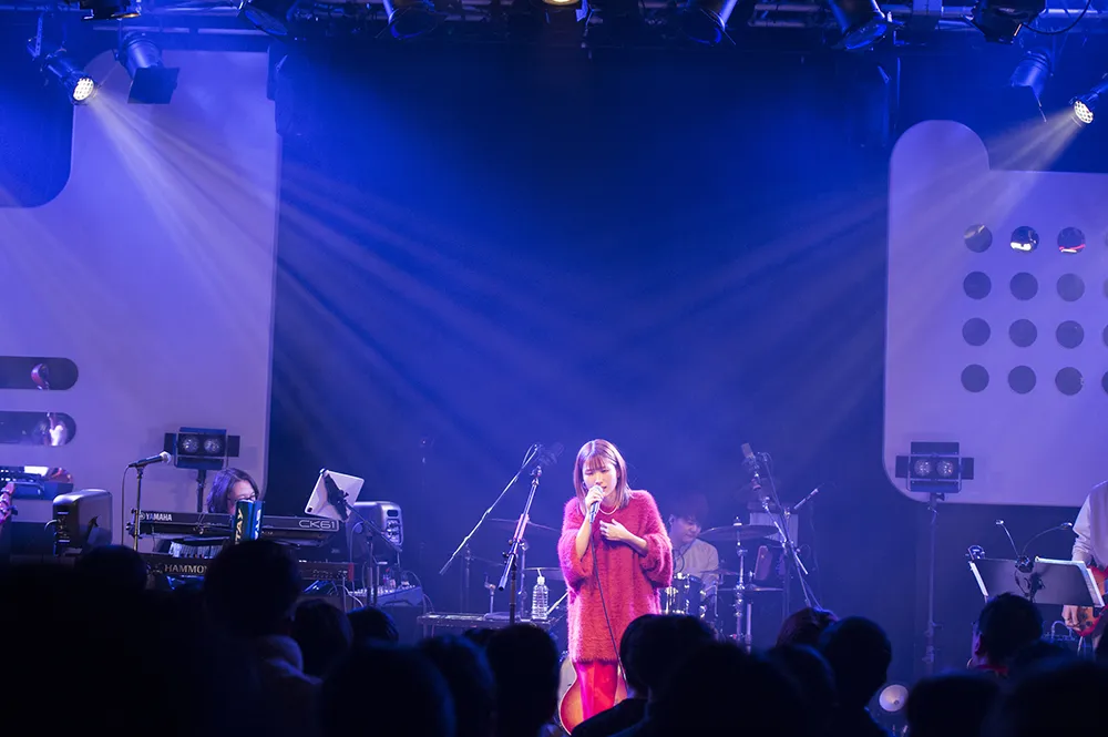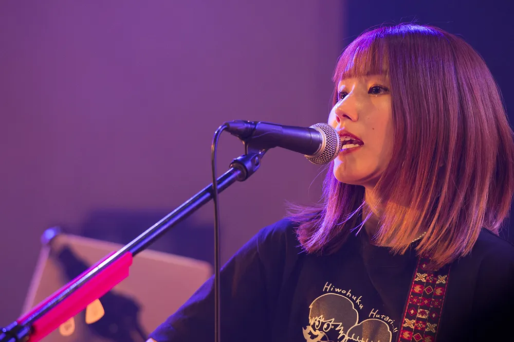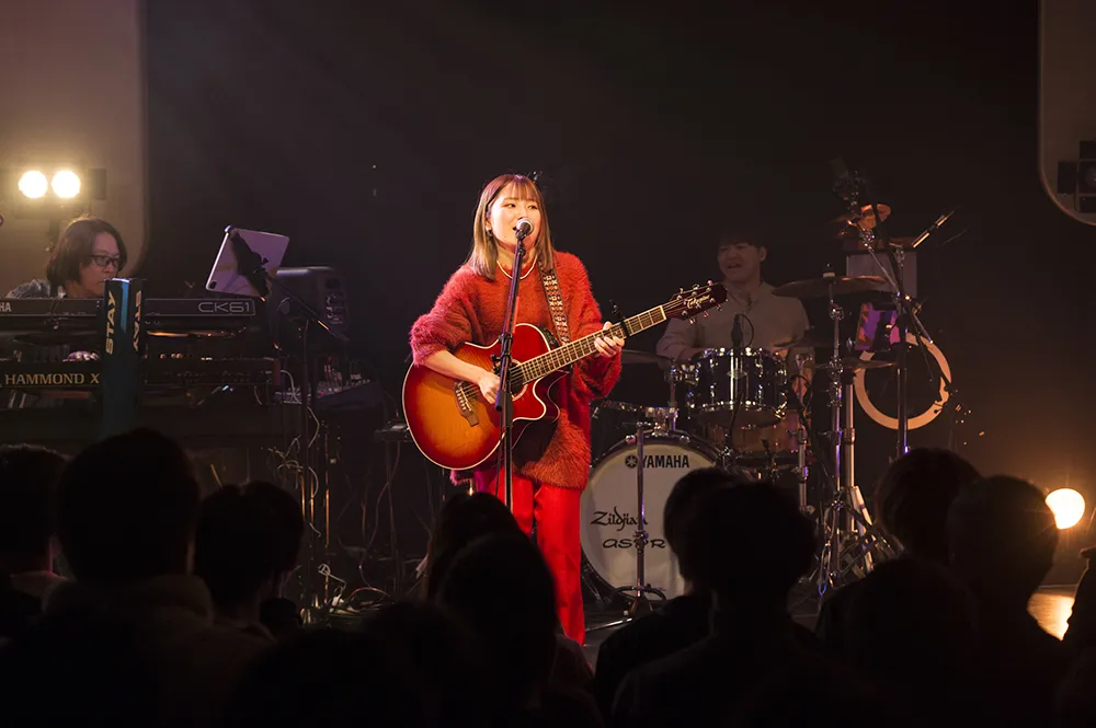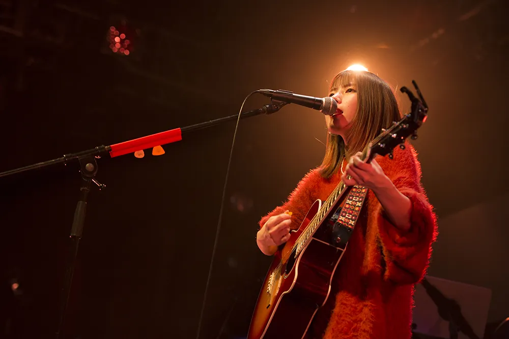 赤い衣装でステージに現れ、アコースティックギターを持つと「意地でも」でライブをスタート。1曲目から、透明感溢れる歌声が爆発していく。「皆さん、立てますか!」と語りかけると、観客も一斉に立ち上がり手拍子で応えていく。続く「雨音スキップ」では一人ひとりと目を合わせるように歌ったり、ピョンピョンと飛び跳ねたり。彼女が楽しそうに歌う姿を見ていると、こちらまで楽しくなってくる。
