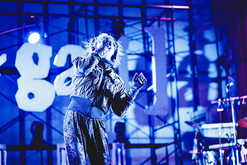 桜井の「野音行くぞー!」の煽りから、「淫美まるでカオスな」へ。ササブチの繰り出すタイトなリズムと、大家の小気味良いパーカッションがダンサブルな打ち込みサウンドに色を添え、「マッキーナ」ではステージでもフロアでもジュリ扇が乱舞。「-踏-」「ケセ」とアップナンバーの連発で、冷えた身体を熱く乗せていく。