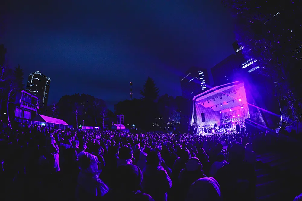 アンコールで披露されたのは「銀河鉄道の夜」と、同じ世界線にある「廃線された未来駅にて」。夜空の下で聴くこの2曲は格別だ。晴れた星空だったらもっと気持ちが良かったのかもしれないが、小雨が降る中で聴くというのも貴重な体験だったと思う。青いサーチライトが会場を照らす「廃線された未来駅にて」での、スコンと抜けるササブチのドラムが心地良い。エンディングでは石井のスキャットに合わせてクラップが沸き上がり、一体感を作り上げた。