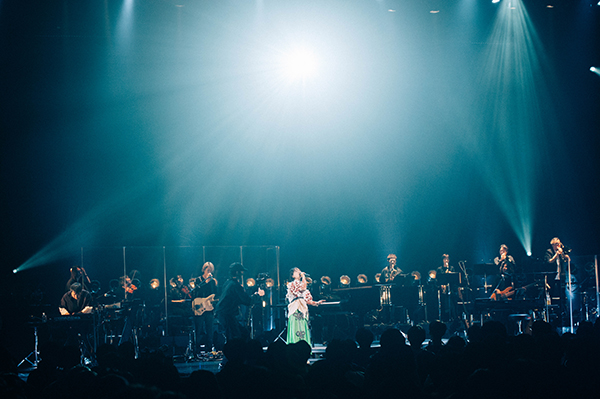 TOMOOのピアノにギター、ベース、キーボードの3人が奏でるアコギが重なる「窓」でバンドメンバーによる弦の合奏によって雨が上がったことが知らされた。そこからまたバンド編成となり、「甘酸っぱいグレープフルーツの歌を書いた10年前にはもっと酸っぱい果物の歌を書いてました」という言葉に導かれた「レモン」で<あなたの太陽になりたくて>とセンチメンタルに歌うと、「ベーコンエピ」では一転して力強く確かなエモーションを感じる歌声を響かせ、ストリングスとホーンも加わった「Cinderella」では狂おしい感情の奔流を押し流す12人のバンドアンサンブルとともにダイナミックにパフォーマンス。三度目の<Baby>というフレーズの際には見ているこちらの目から自然と涙が流れるほど感動的で、本ツアーのクライマックスと言っていいくらい、忘れられない演奏となっていた。