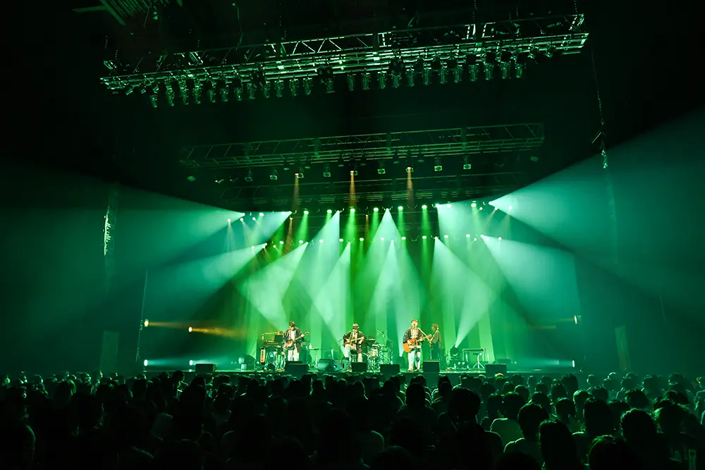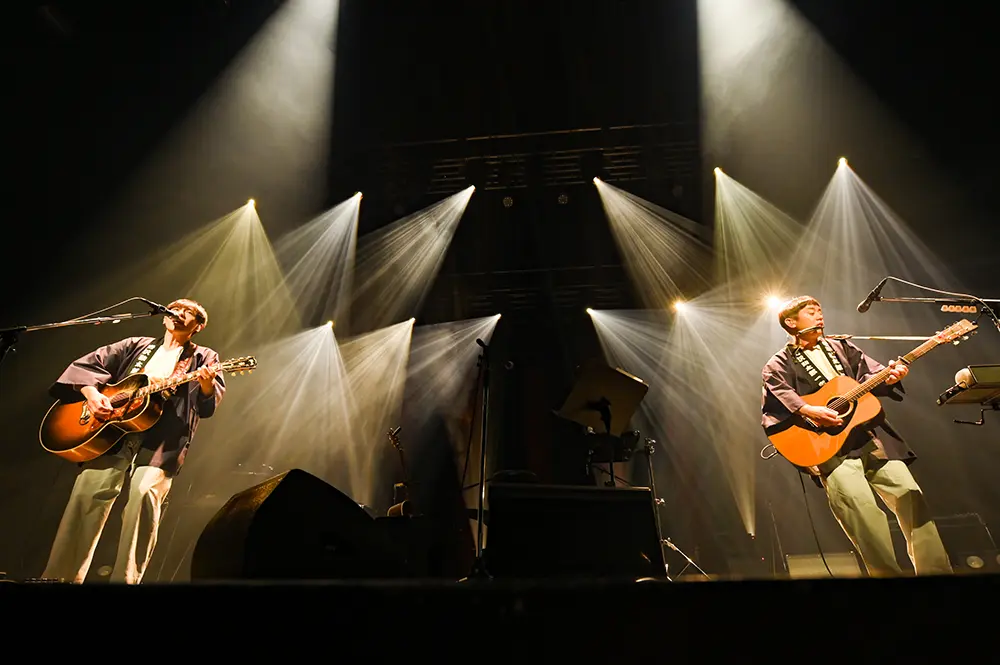 続いてはトーク多めの義兄弟コーナー。岩沢が歌とアコギとハープ、寺岡が歌とベースという編成だ。25年ほど前、ゆずのプロデュースを担当した寺岡がベースを弾くのを見て、20歳の頃のゆずの二人が「しびれた」とのエピソードを、岩沢が話す場面もあった。今回のステージでも岩沢が何度も、「ベース寺岡呼人!」とうれしそうに紹介していた。「僕が岩沢くんに歌ってほしい曲たちをリストに挙げました」との寺岡の発言に続いて、ゆずの「方程式2」が演奏された。ゆずの曲を“義兄弟”の歌とコーラス、ギターとベースで演奏することによって、新たな魅力も見えてきた。寺岡が大好きだという「ぼんやり光の城」は、首都高の横羽線から見えてくる工場群の風景をモチーフにした楽曲で、横浜のご当地ソングとも言えそうな曲だ。伸びやかな岩沢の歌声と寺岡の温かなコーラスとグルーヴィーなベースがいい感じだ。曲に対する演奏者の愛情が楽曲を光り輝かせていると感じた。岩沢からのリクエストで、寺岡の「日々平安」も演奏された。ここでは2本のアコギとハープでの演奏。丁寧な歌とハーモニーからは、日常の日々を生きていくことの尊さのようなものも伝わってくるようだった。日替わり曲のゆずの「灰皿の上から」はバンドも加わっての演奏。どこまでも伸びてゆく岩沢の歌声と広がりのあるバンドの演奏が気持ち良かった。灰皿の上に大空が広がっているかのようだった。