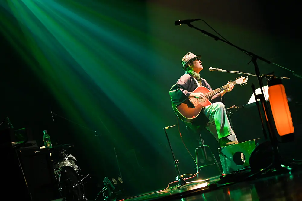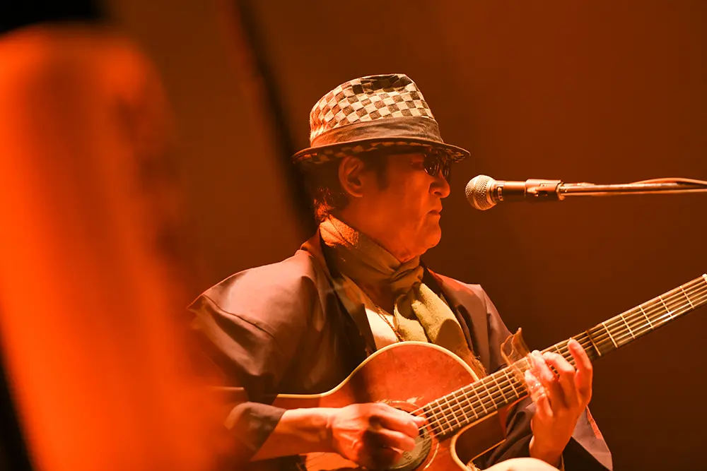 「南の島に住んでいるブルースの大王を呼ぼう!」という岩沢の呼び込みで内田が登場。末っ子のステージに続いては、父ちゃんこと内田のステージだ。スライドギターによる繊細な調べでの「ムーンリバー」からソロ曲「美らフクギの林から」への流れに、うっとりしてしまった。フクギの林に月の光が降り注ぐ光景が見えてくるようだった。三線を彷彿させる旋律も織りまぜての自在な演奏と滋味あふれる歌声に聴き惚れた。客席から「勘太郎さ~ん!」と声が飛ぶと、「はい、ありがとう」と返事。さらに、加川良のカバー曲である「教訓Ⅰ」とソロ曲「グッバイ クロスロード」をブルースフィーリングあふれる歌とスライドギターで披露。「教訓Ⅰ」の歌詞は今の時代にもリアルに響いてきた。「グッバイ クロスロード」ではブルースギター全開。音楽とは時代を超えて響いてくるものであることを実感する演奏だ。