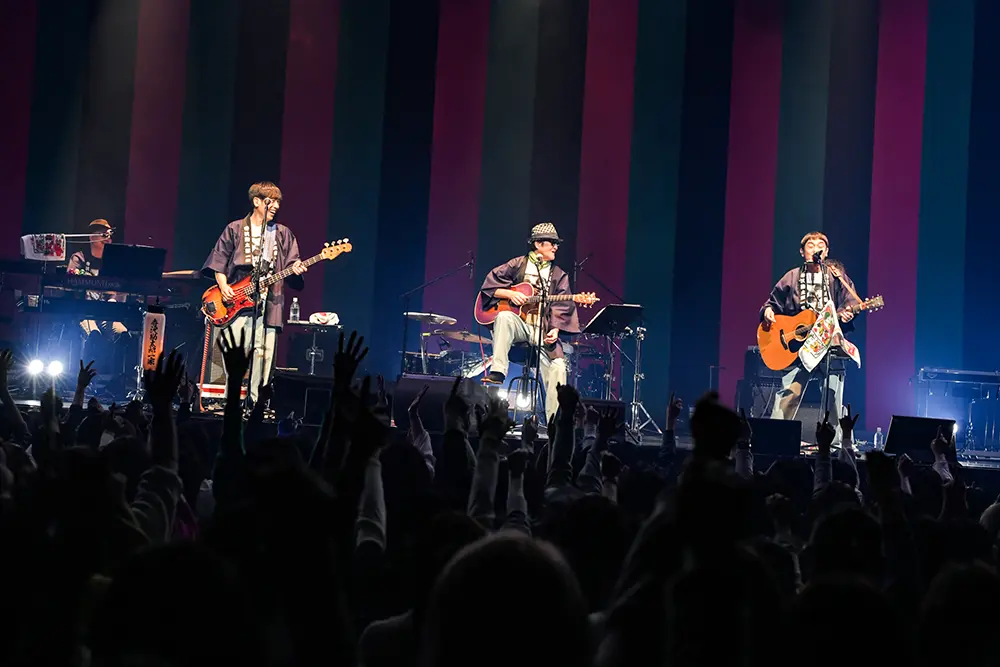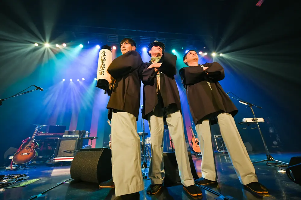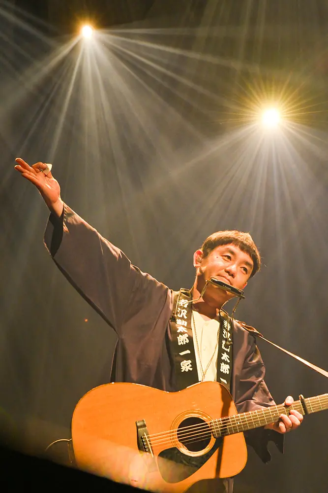 後半は一家の3人とバンドが勢揃いして、ゆずの「ヒーロー見参」が演奏された。「寺沢勘太郎一家見参」と言いたくなるような熱いプレイの連続だ。Dr.kyOnがグリッサンド奏法を披露したり、岩沢が両手でハープを吹いたり。続いての「始発列車」でもメンバー全員が楽しそうに演奏する姿が印象的だった。岩沢の力強い歌声に、寄り添うように寺岡が歌っている。岩沢のハープ、内田の超然テクニックのブルースギター、Dr.kyOnのカズーなども加わっての自在な演奏が楽しい。「かんちゃん、いってみよう!」「こうちゃん!」など、息の合った掛け合いもからは一家の仲の良さも伝わってきた。憂歌団の「嫌んなった」は、内田のブルースギターで始まり、寺岡と岩沢がブルースフィーリングあふれる歌を披露。それぞれのメンバーのソロ演奏に対して、「待ってました!」「よっ! 大統領!」と声をかけたくなった。本編ラストは1975年にリリースされた憂歌団のデビューシングル「おそうじオバチャン」。内田の歌声に岩沢がハモっている。寺岡が会場内を沸かせるセリフを発している。3人それぞれの個性的な魅力を堪能するとともに、それぞれの個性の融合のおもしろさも満喫した。会場内にはたくさんの拍手と歓声と笑顔。
