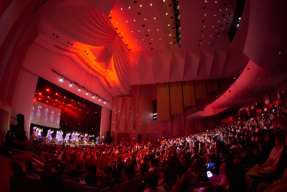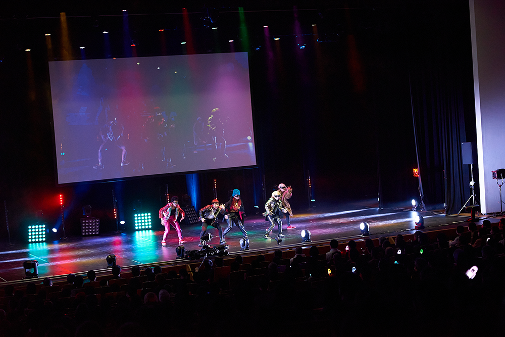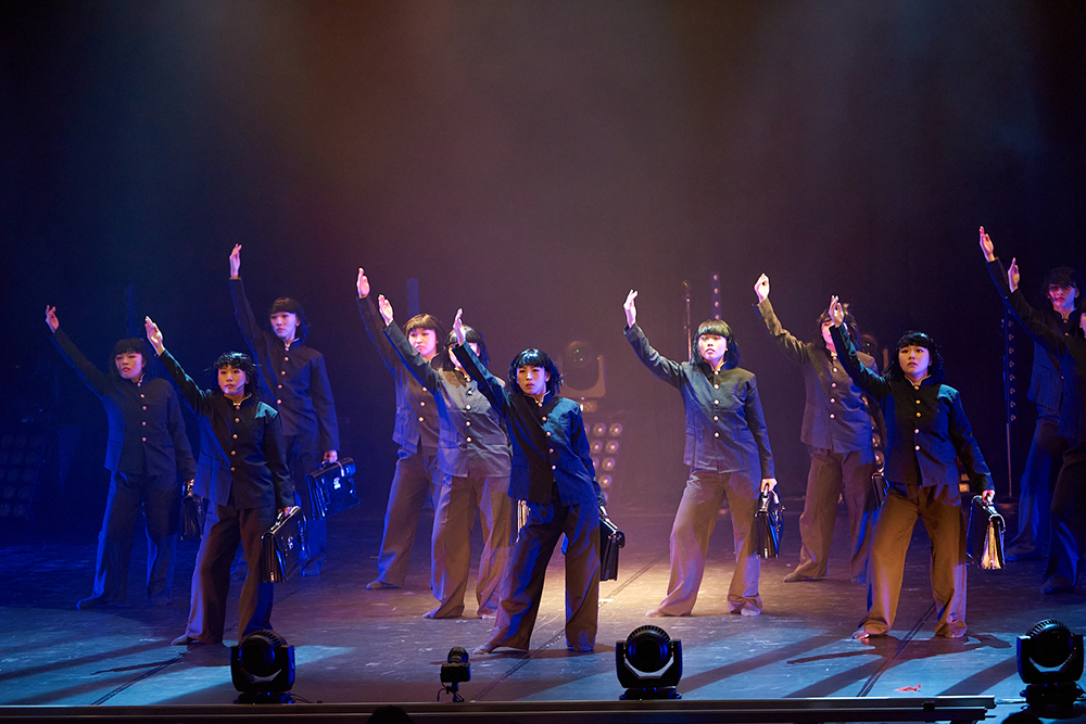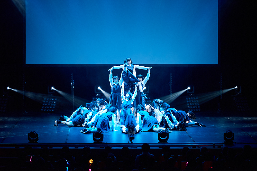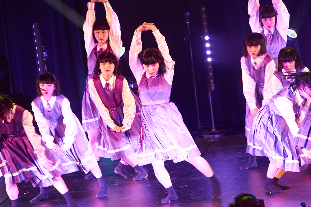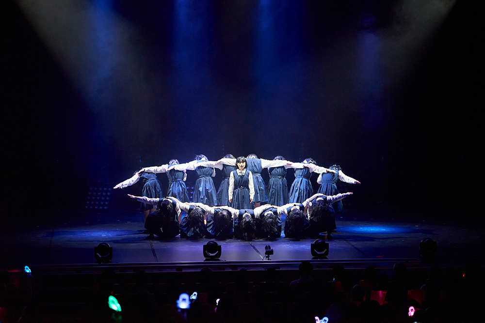 オープニングはメンバーが1人ずつステージに勢いよく飛び出してきて、自己紹介がてらソロダンスを披露していく。そこから、ライブはいきなり岩崎宏美の「シンデレラ・ハネムーン」へ。彼女たちの名前がワールドワイドに広まったアメリカのオーディション番組、あの『アメリカズ・ゴッド・タレント』(以下、AGT)のシーズン18に出場したときに使用したナンバーの登場に、場内から悲鳴が上がる。ダンサー全員がおかっぱ頭にジャンパースカートの制服姿というアイコニックなルックス。メンバーは19人、身長差があるのに動きは全員揃っていて、まるで生きている人形を見ているようで、ある意味奇妙で怖い。けれどもそのダイナミックな動き、完璧なシンクロで踊るダンスは圧倒的。途中、曲のテンポがスピードアップしてもそれが崩れることはない。なのに、みんなが一斉に変な顔をしたりしている。カッコいいのか怖いのか、コミカルなのか頭の中は冒頭から混乱状態。