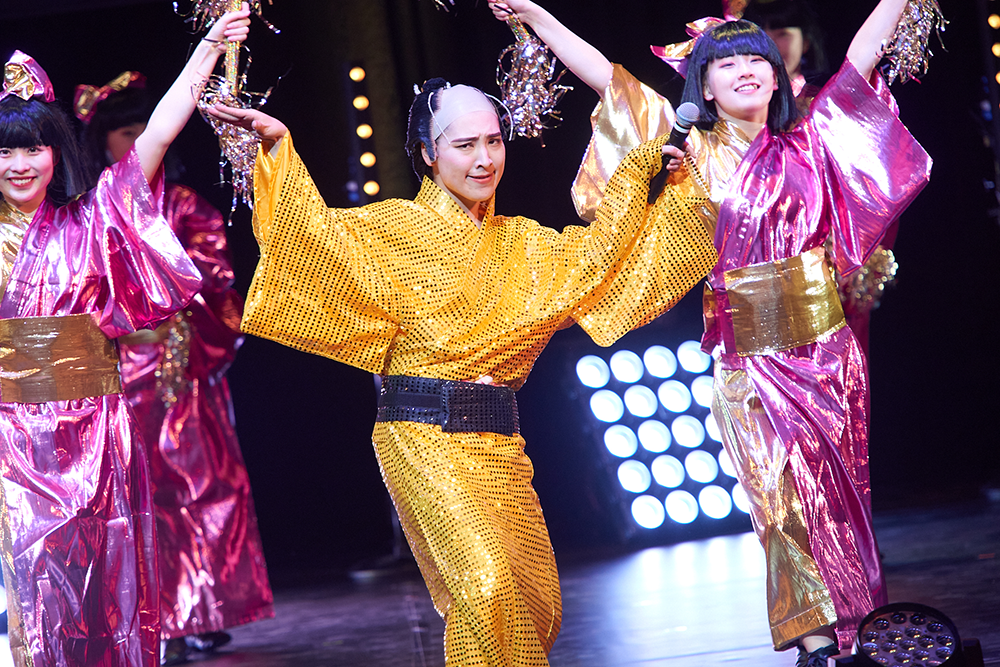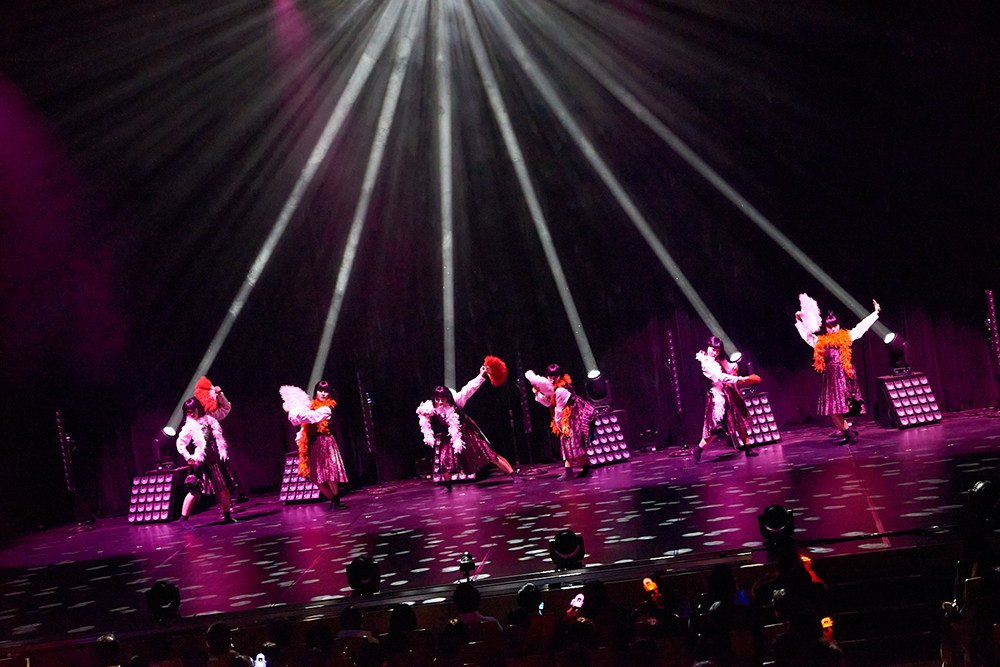 開演時間前。場内に入ると、ペンライトを手に座席を埋め尽くしている客層にまずは驚愕! メンバーと同世代ぐらいのダンス好きな人々が集まっているのかと思いきや、そこにいたほとんどの人は、昭和の日本、華やかに沸き立ったあのバブル期を謳歌してきた世代の人々だった。だからなのか、さっきからBGMで流れてくる昭和歌謡な懐メロポップスも、どこかウキウキした様子で楽しんでいる。昭和ムード満載、どこかレトロな異空間にタイムスリップしたような不思議な感覚に包まれた頃、BGMがYMOの「RYDEEN」に切り替わったところで、いよいよライブは開幕。